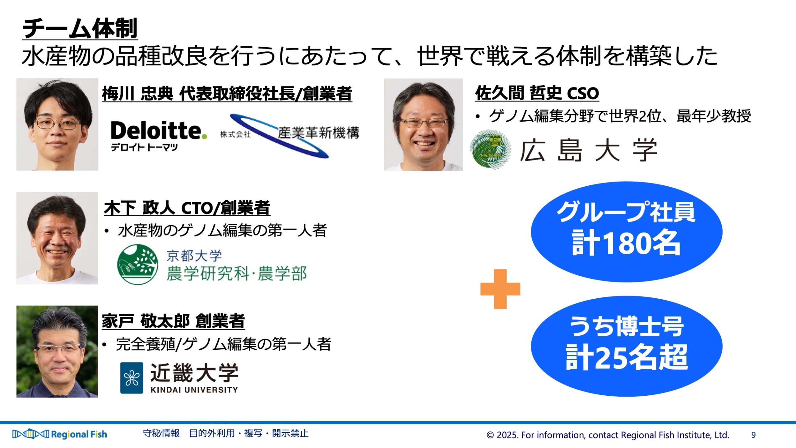 チームですが、産業革新機構出身の私、梅川が事業面を見ながら、水産物のゲノム編集の権威である京都大学の木下(政人さん)、近畿大学の家戸(敬太郎さん)とともに共同創業しました。