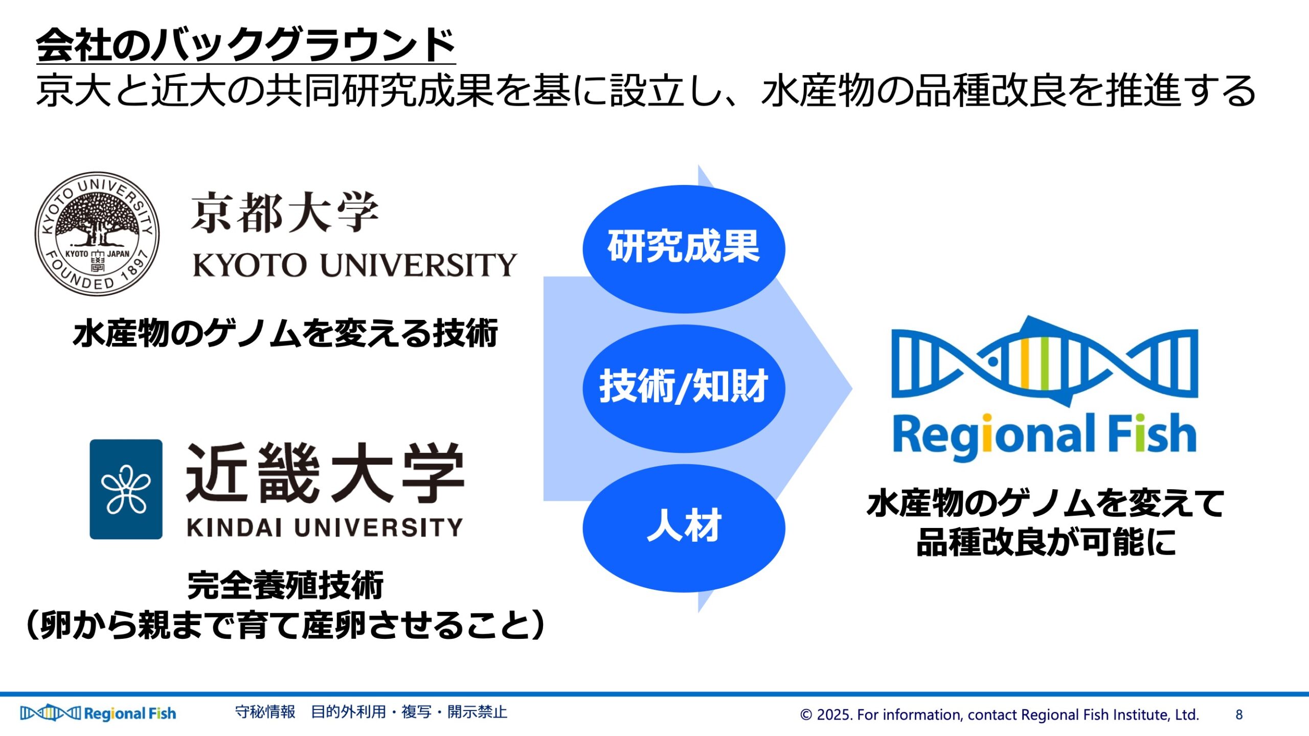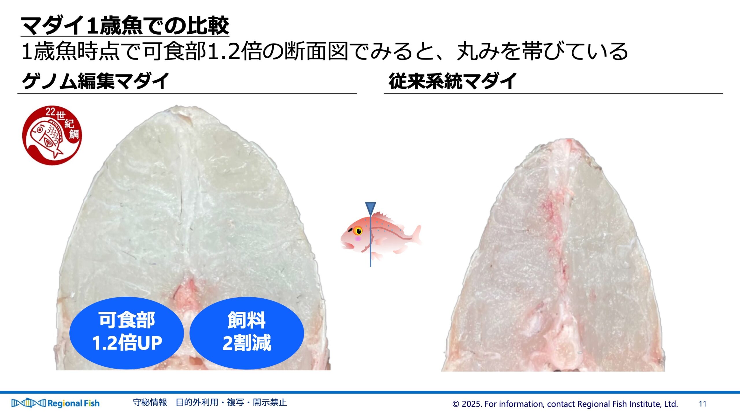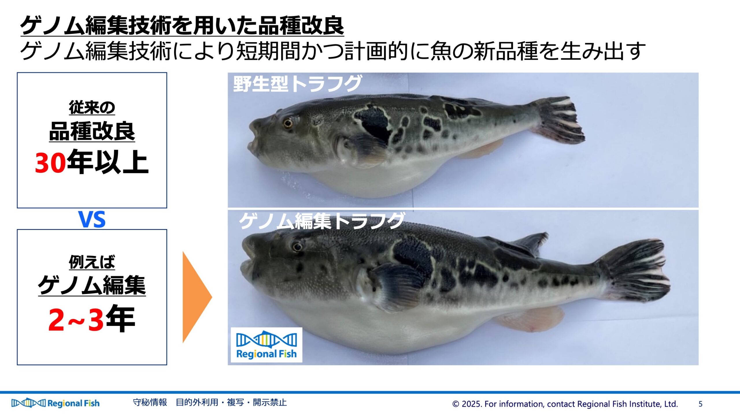 こういった京都大学の水産物のゲノムを変える技術と、近畿大学の完全養殖技術を入れたことによって、世界でも唯一、我々が水産物の品種をどんどん変えることができるようになりました。