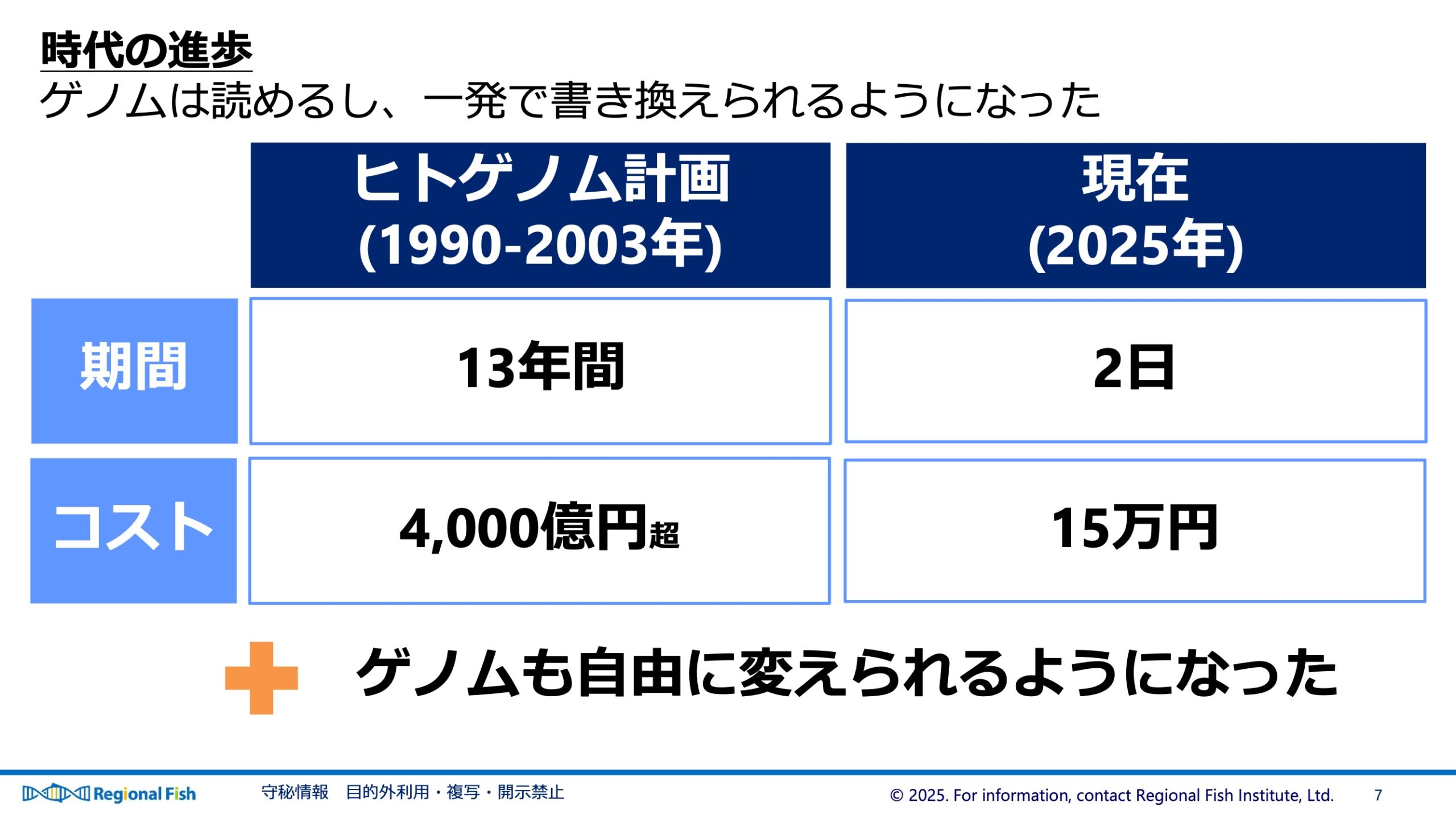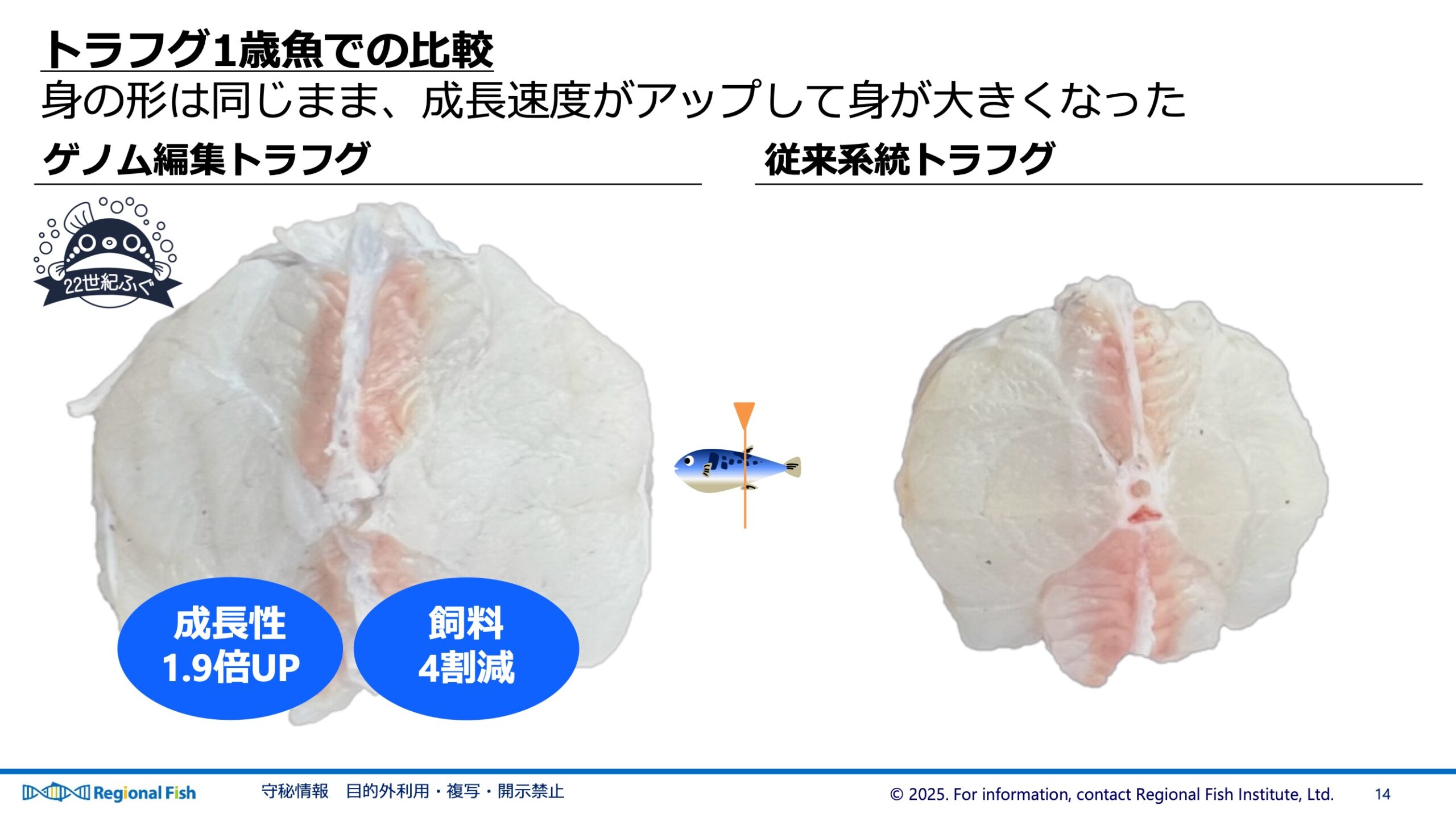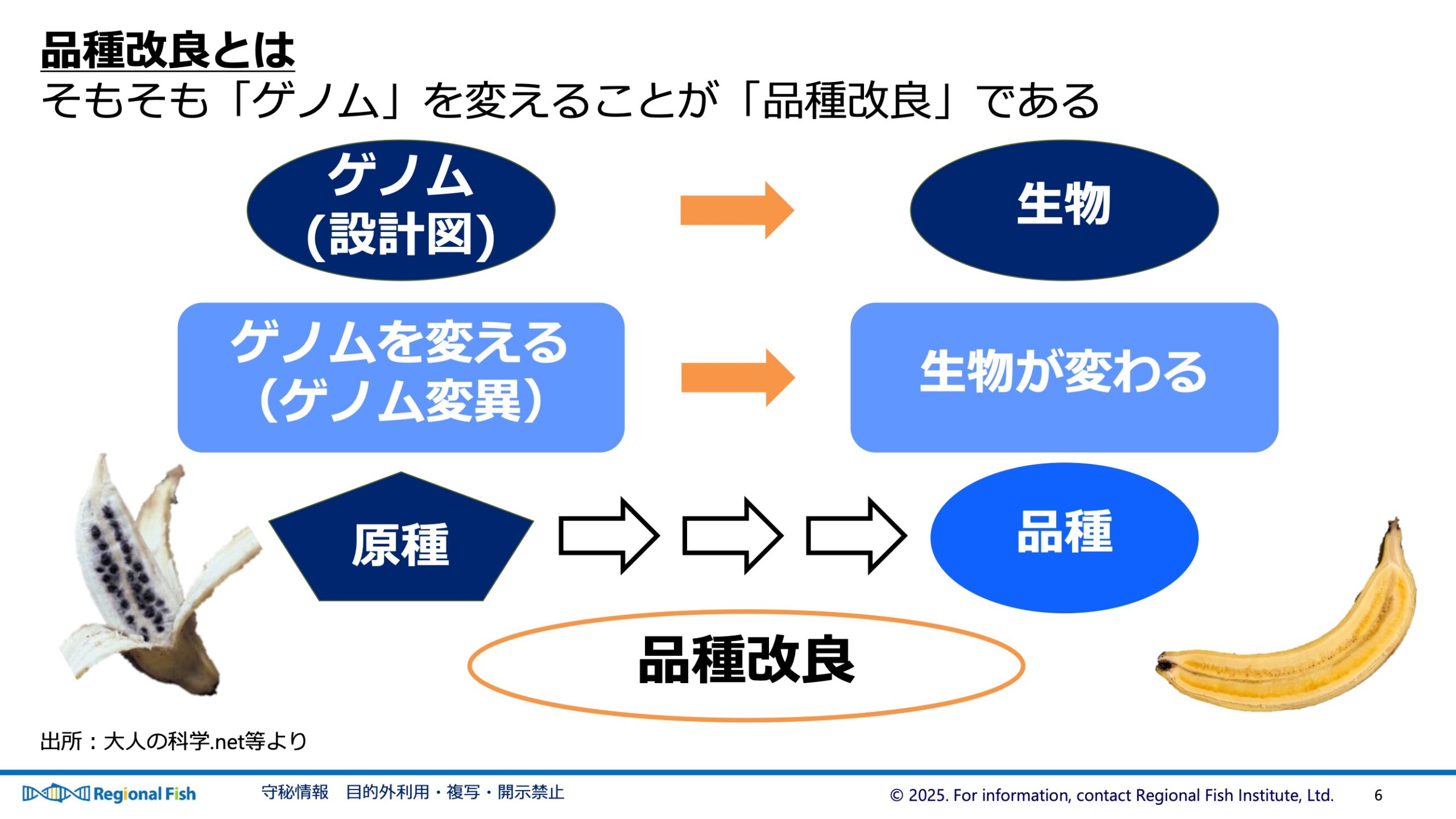 こういった京都大学の水産物のゲノムを変える技術と、近畿大学の完全養殖技術を入れたことによって、世界でも唯一、我々が水産物の品種をどんどん変えることができるようになりました。