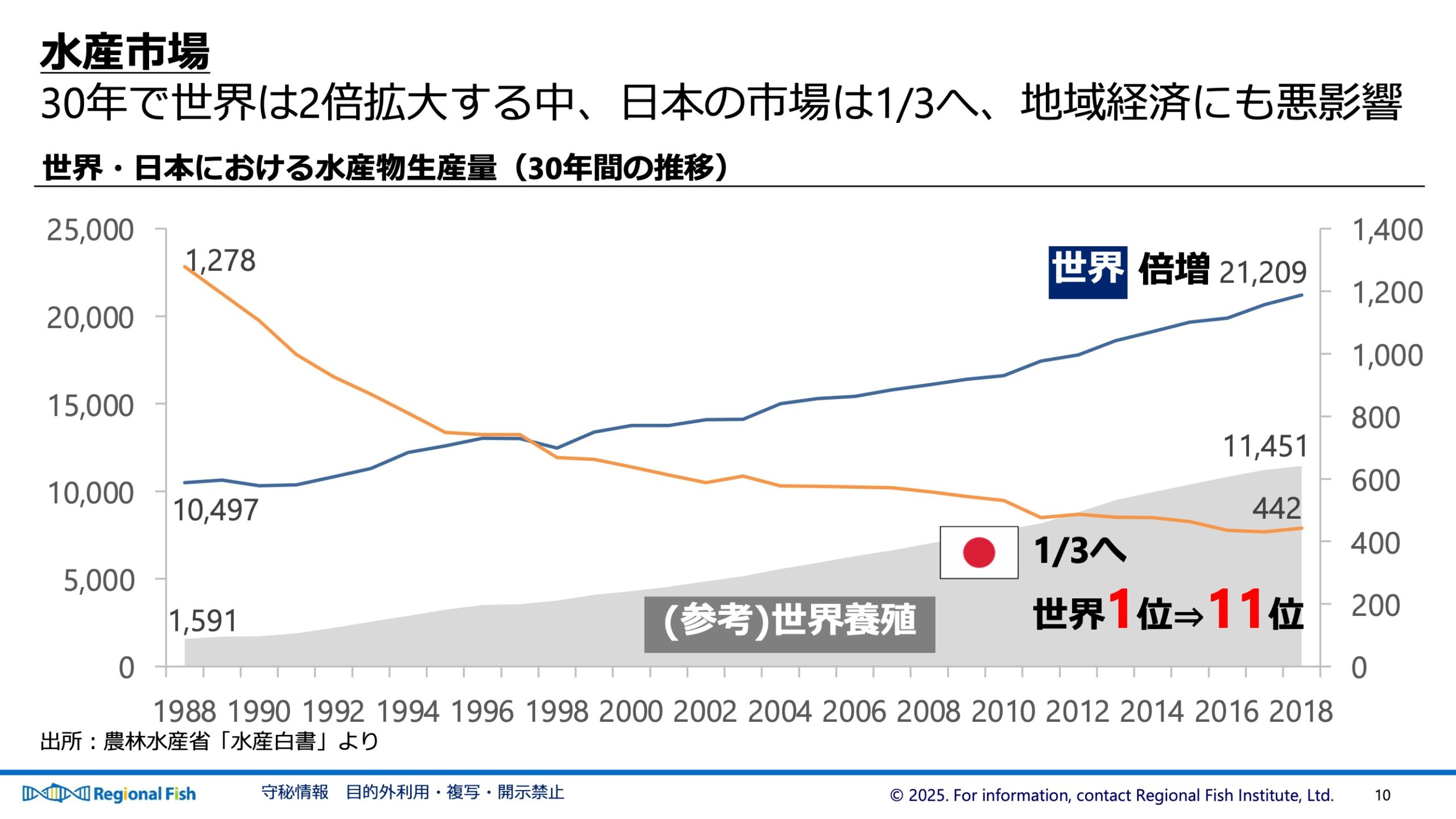 問題意識としてあるのは、この30年で水産物の生産量は世界では倍増したのに、日本は3分の1に減少し、世界1位から11位に落ちていることです。