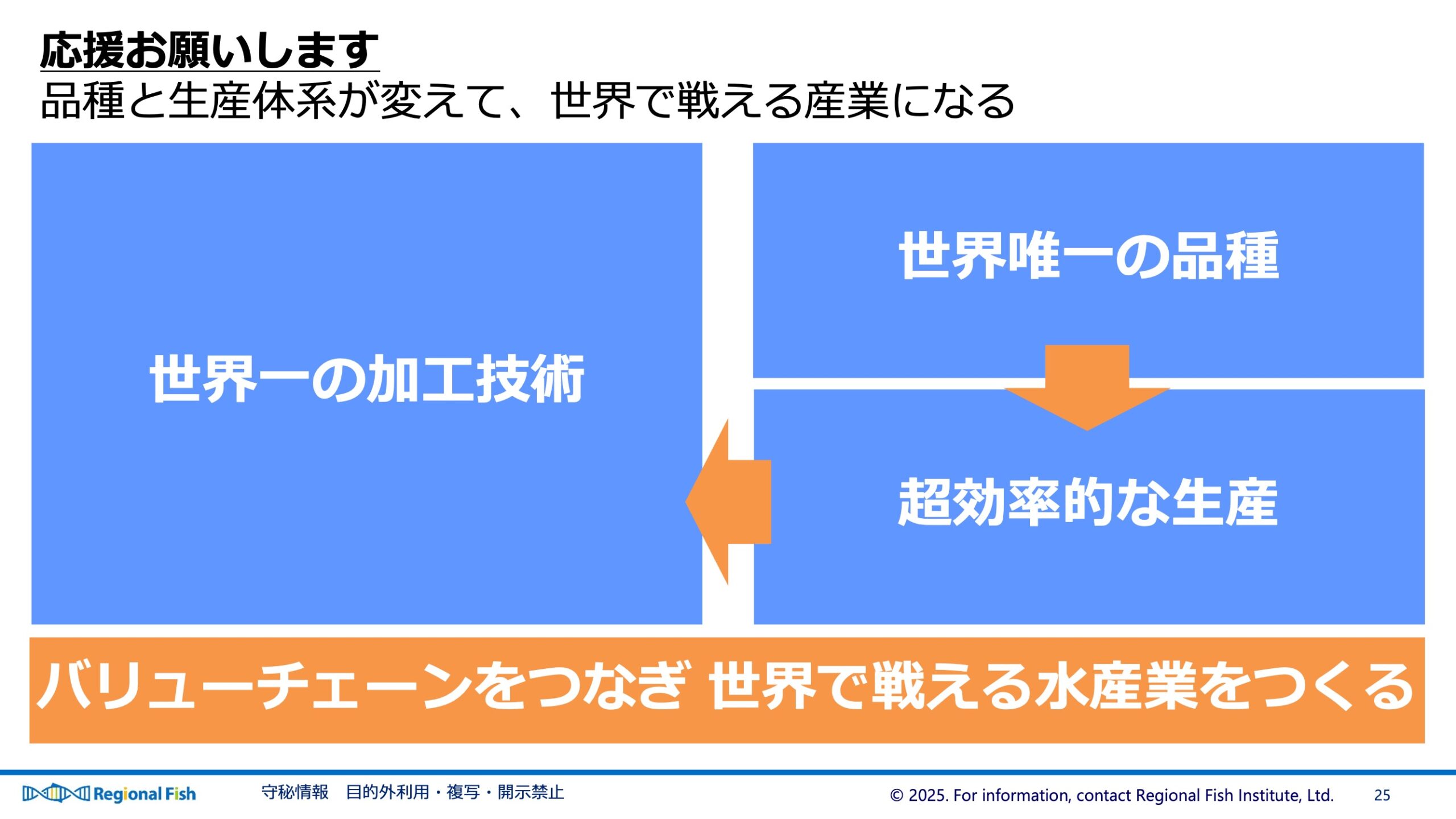 それを超高効率な生産、加工技術へとつなげ、バリューチェーンをオープンイノベーションでつないでいくことができれば、みんなで世界で戦える水産業を創っていけるのではないかと思っています。