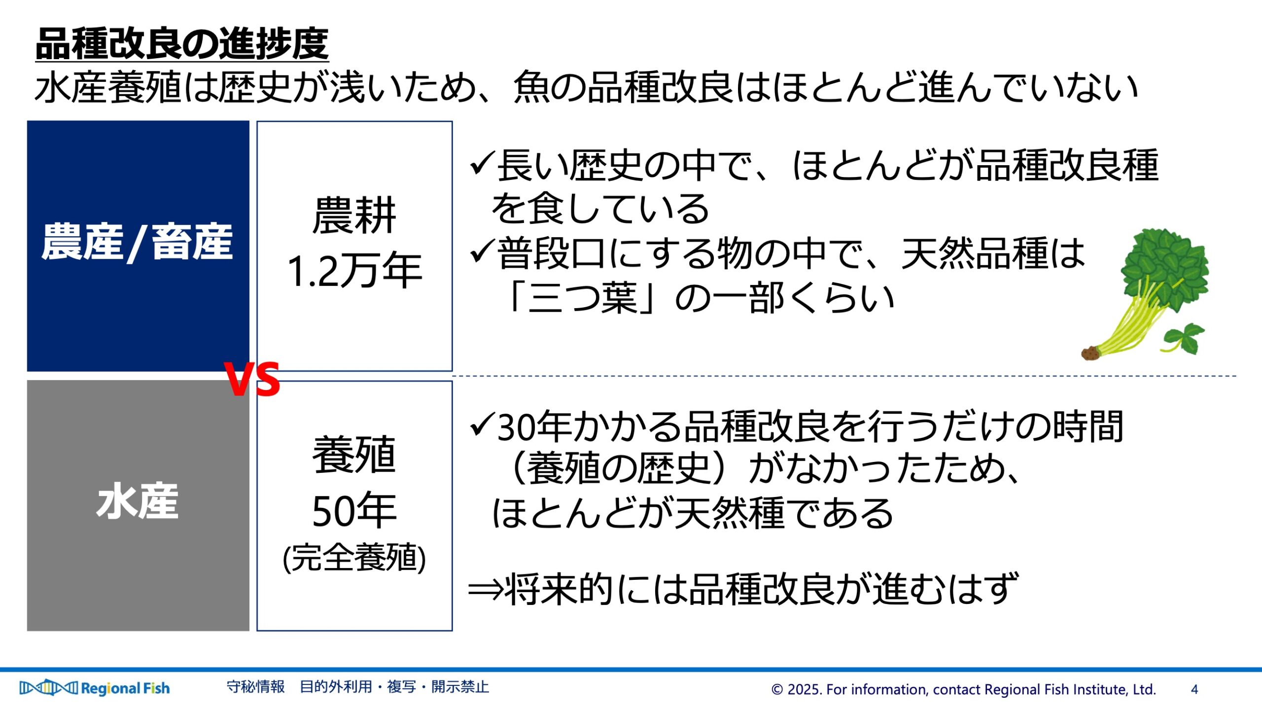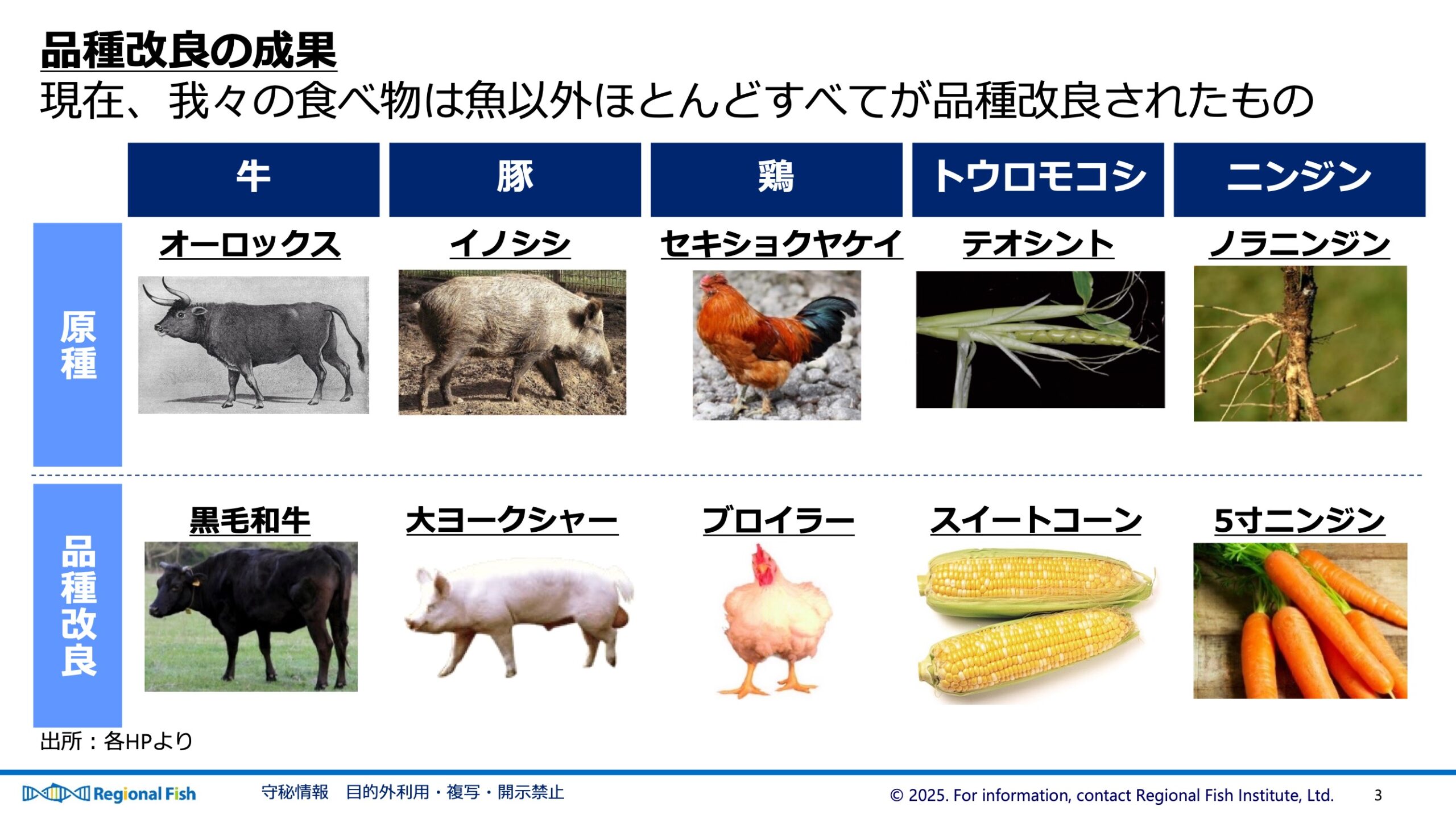 そのため、30年かかる品種改良を行うだけの時間がなかったので、「水産物は天然ものが美味しい」と言われるように、品種が変わっていないのです。