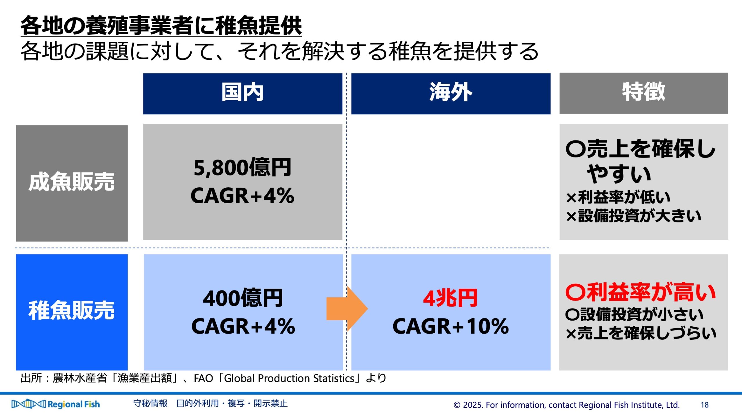 成魚販売からスタートしましたが、現在のメイン事業は、稚魚を養殖事業者に販売して、名産品を作ってもらうというものです。
