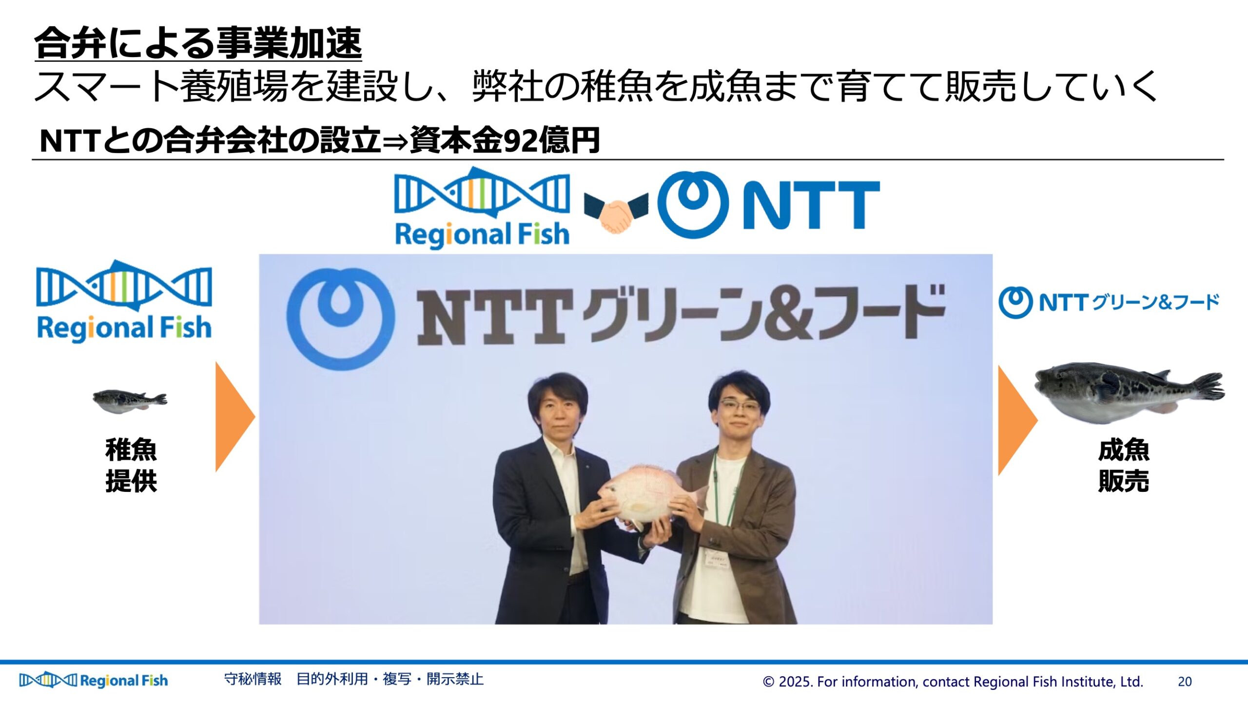 そこでNTTと合弁会社を組み、我々はこちらに稚魚を提供し、作った成魚を販売しています。