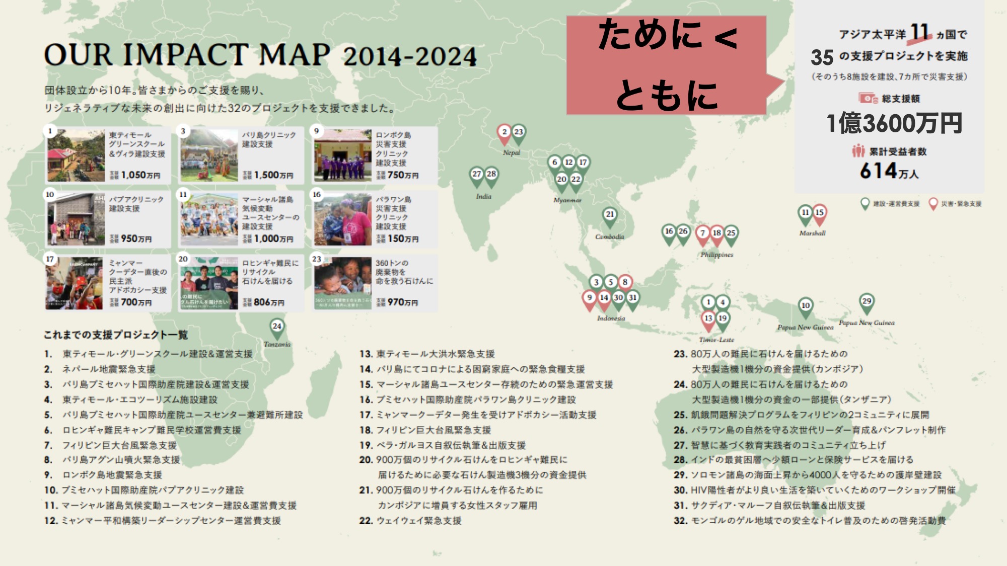 直近10年間で、インパクトヒーローとともに、災害支援、平和構築、難民支援など、11カ国で35プロジェクトを実施、614万人を支援してきました。