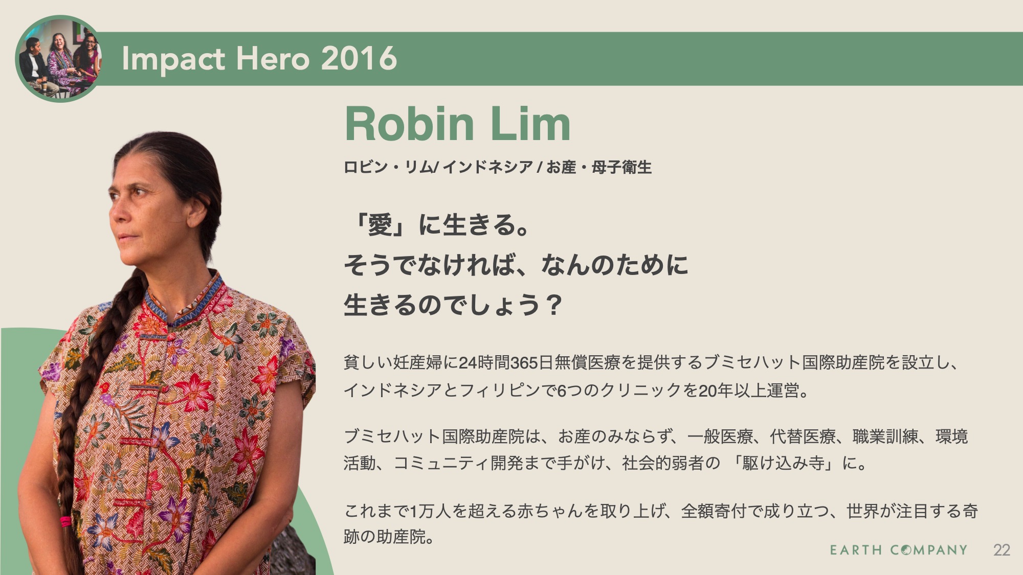 ▶編集注:「Unsung Heroes of Compassion (謳われることなき英雄)」のこと。受賞の経緯は団体設立背景・ビジョン・ミッション(Earth Company)に詳しい。
