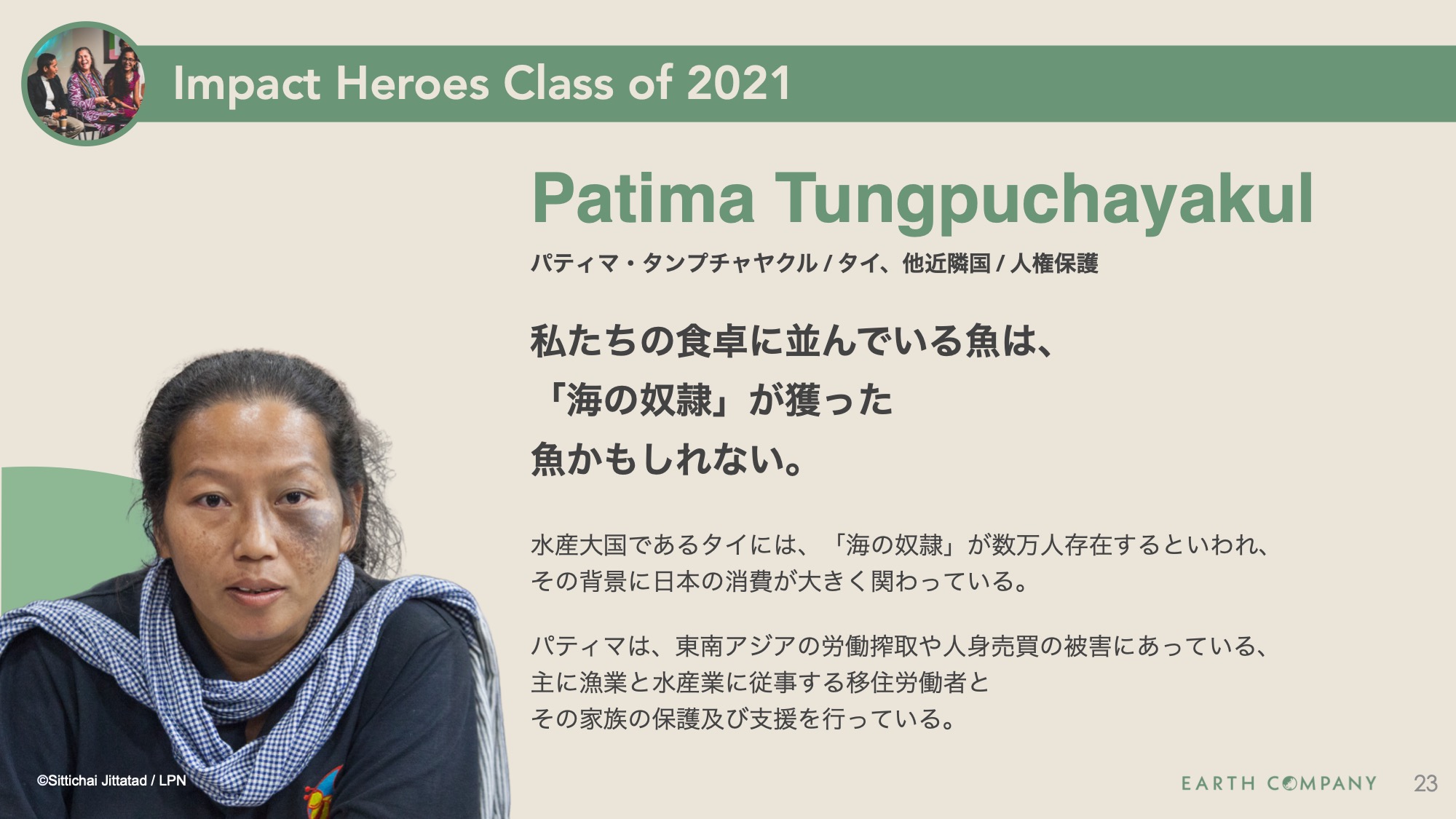 2人目は、東南アジアで現代奴隷の撲滅に奮闘する、タイ人の人権活動家、パティマ・タンプチャヤクルです。