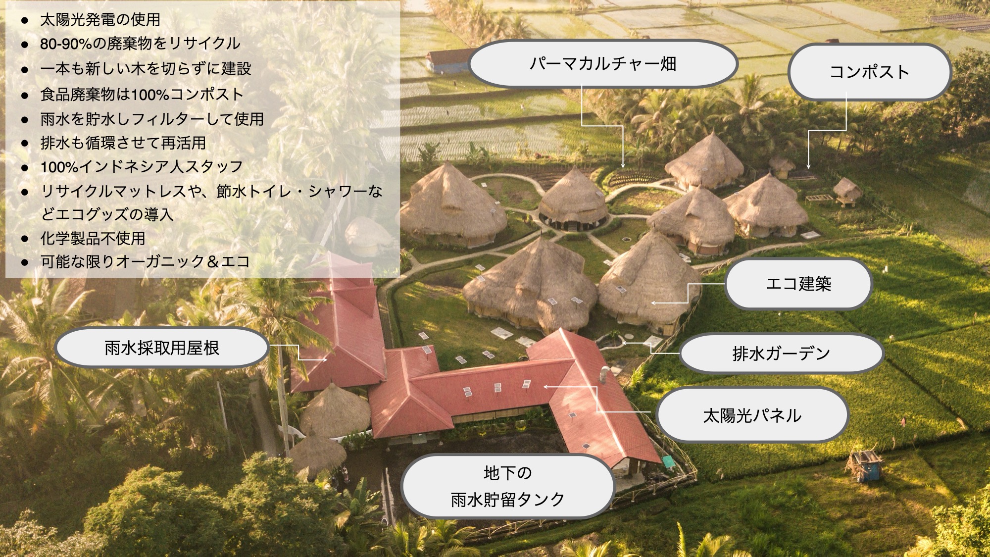 我々のエシカルホテル「Mana Earthly Paradise」は、新しい木を1本も切らずに家屋の廃材で建設し、照明は太陽光発電を用いて、雨水を貯め、野菜を育てるという循環を体現しています。
