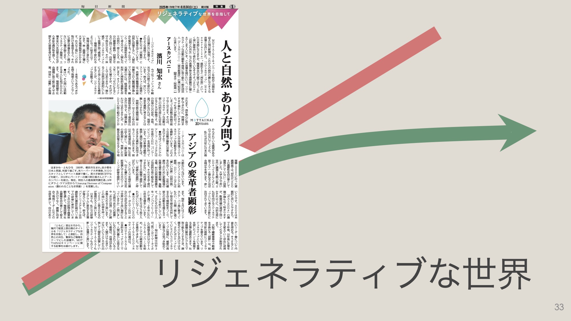 まさに、このようなリジェネラティブな世界に関する、私へのインタビュー記事が、5日前(2025年8月30日)の毎日新聞の朝刊に、大きく掲載されました。