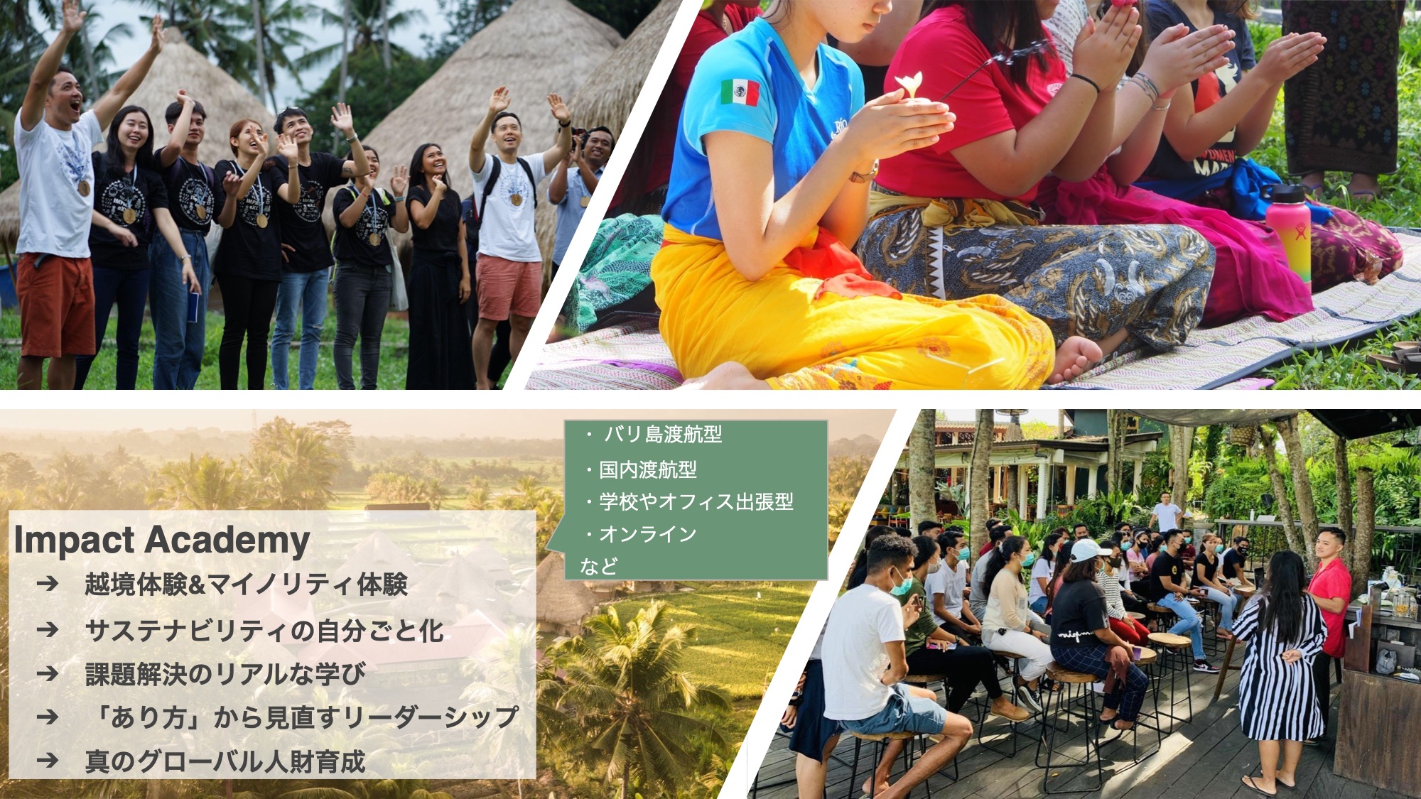 そのため、我々は、世界各国の幅広い年齢層に、越境体験、課題解決、リーダーシップやグローバルマインドを育む体験を、対面・オンラインを通じて提供しています。