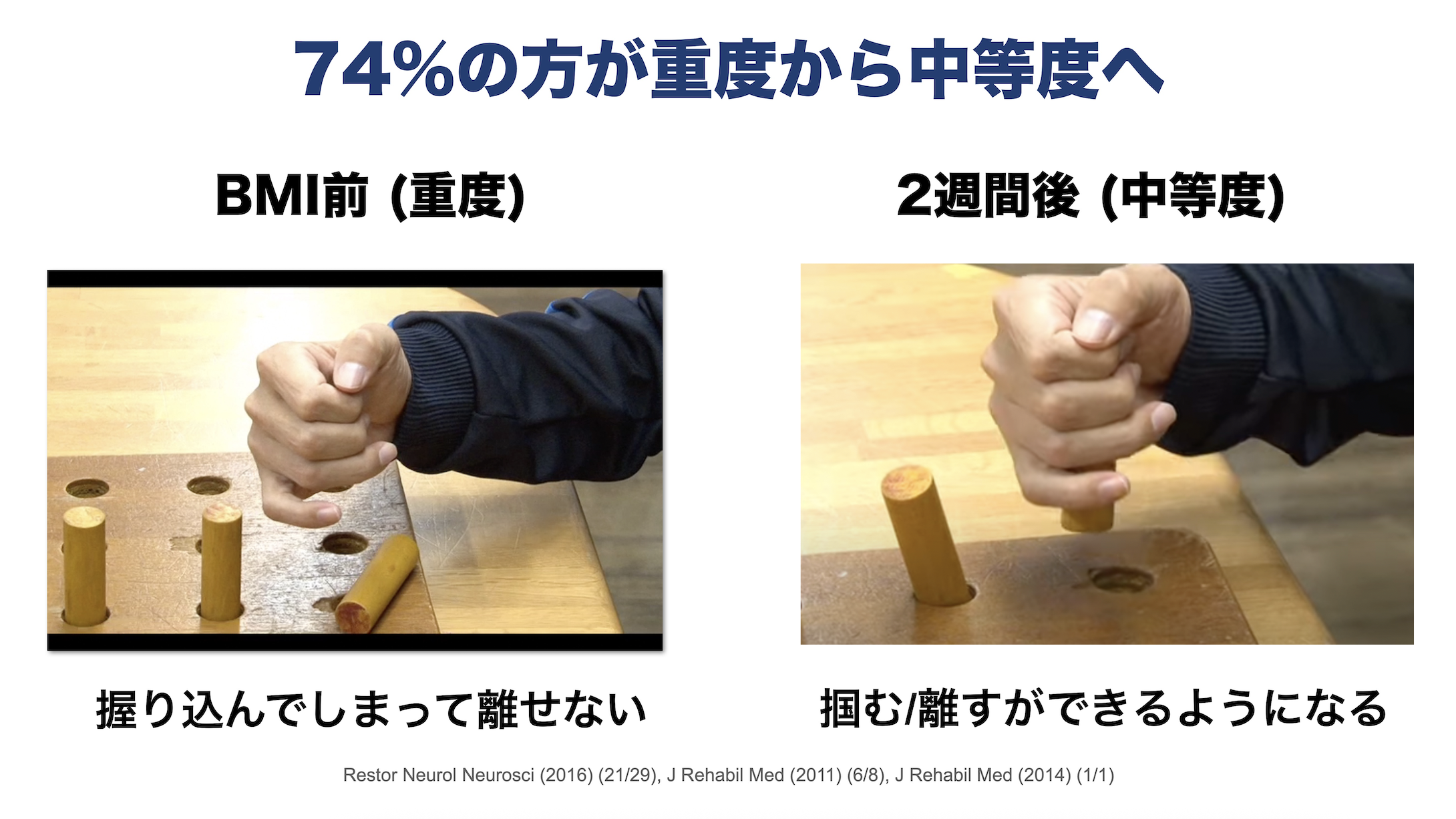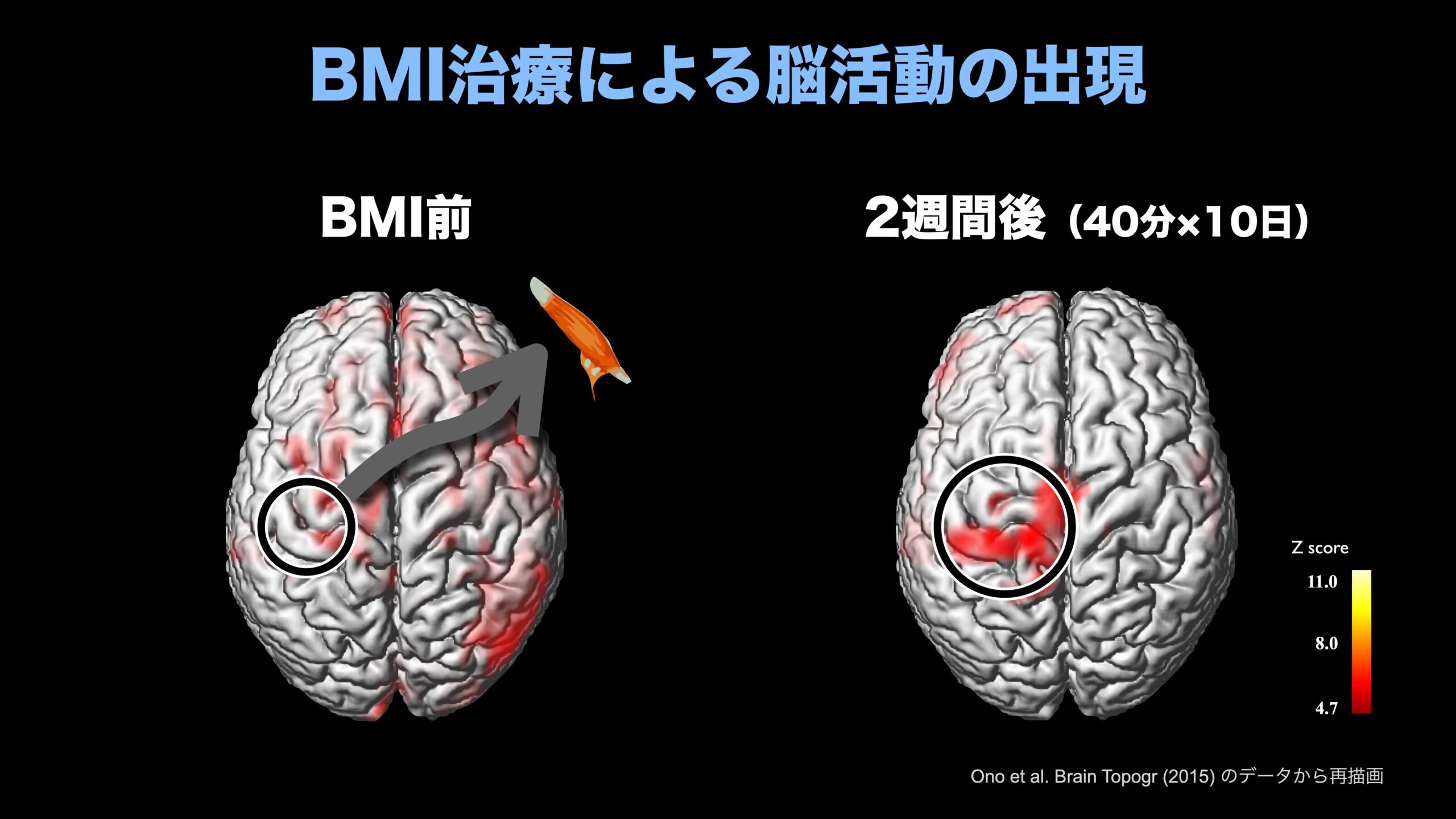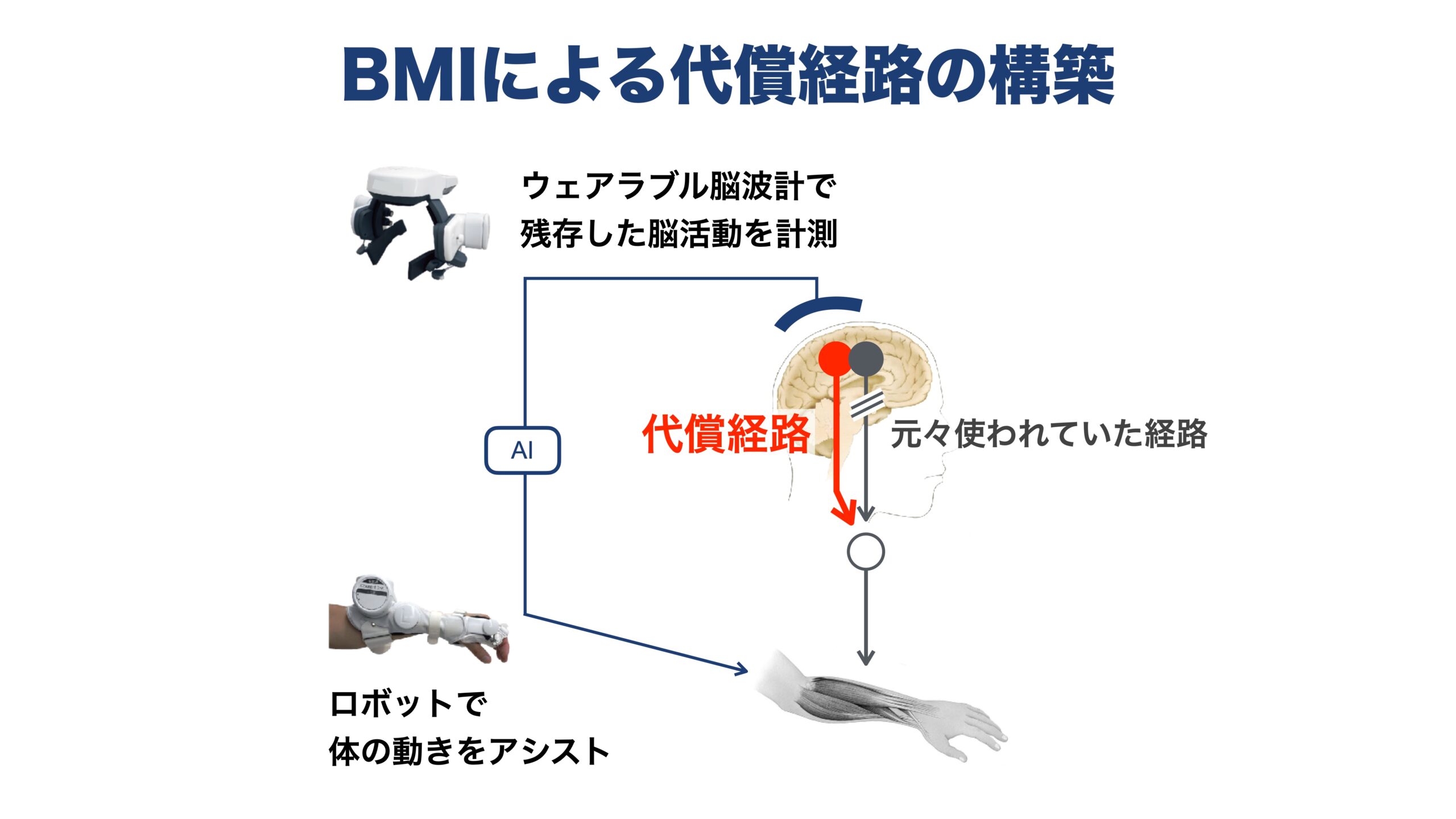 このように、脳波計で残存した脳活動を計測し、ロボットで体の動きをアシストすることで、代償経路が構築され、麻痺した手を回復できることを、私たちは世界に先駆けて示したのです。