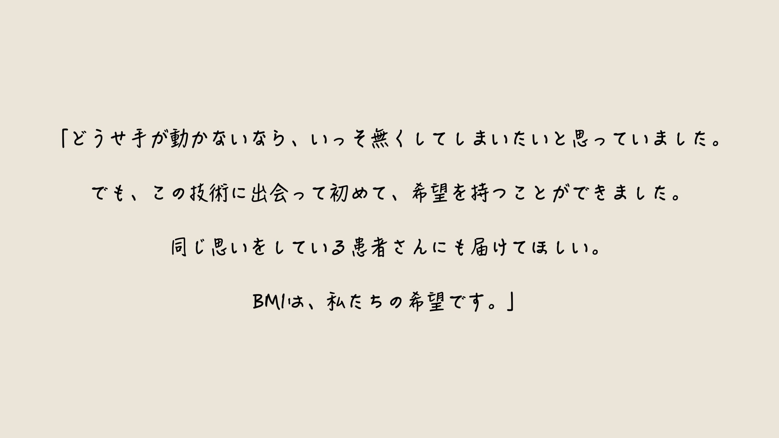 そして、BMIを必要とする患者さんに届けるために、必ず社会実装しなければいけないと、胸に誓って、ここに戻ってきました。