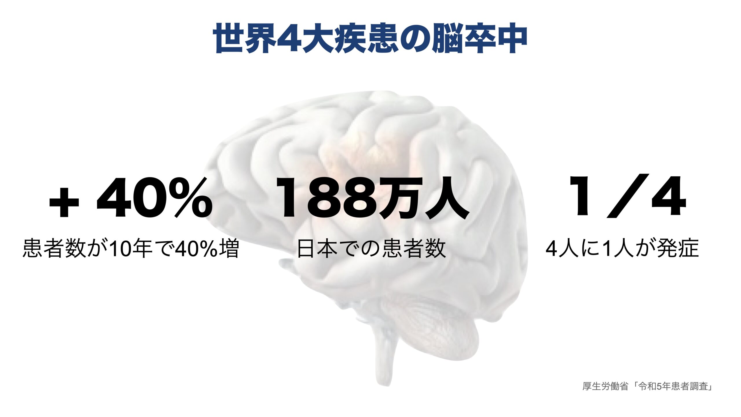 4疾病4 の1つである脳卒中は、高齢化に伴い患者数がここ10年で40%も増加し、国内で188万人もの方が後遺症に苦しんでいます。