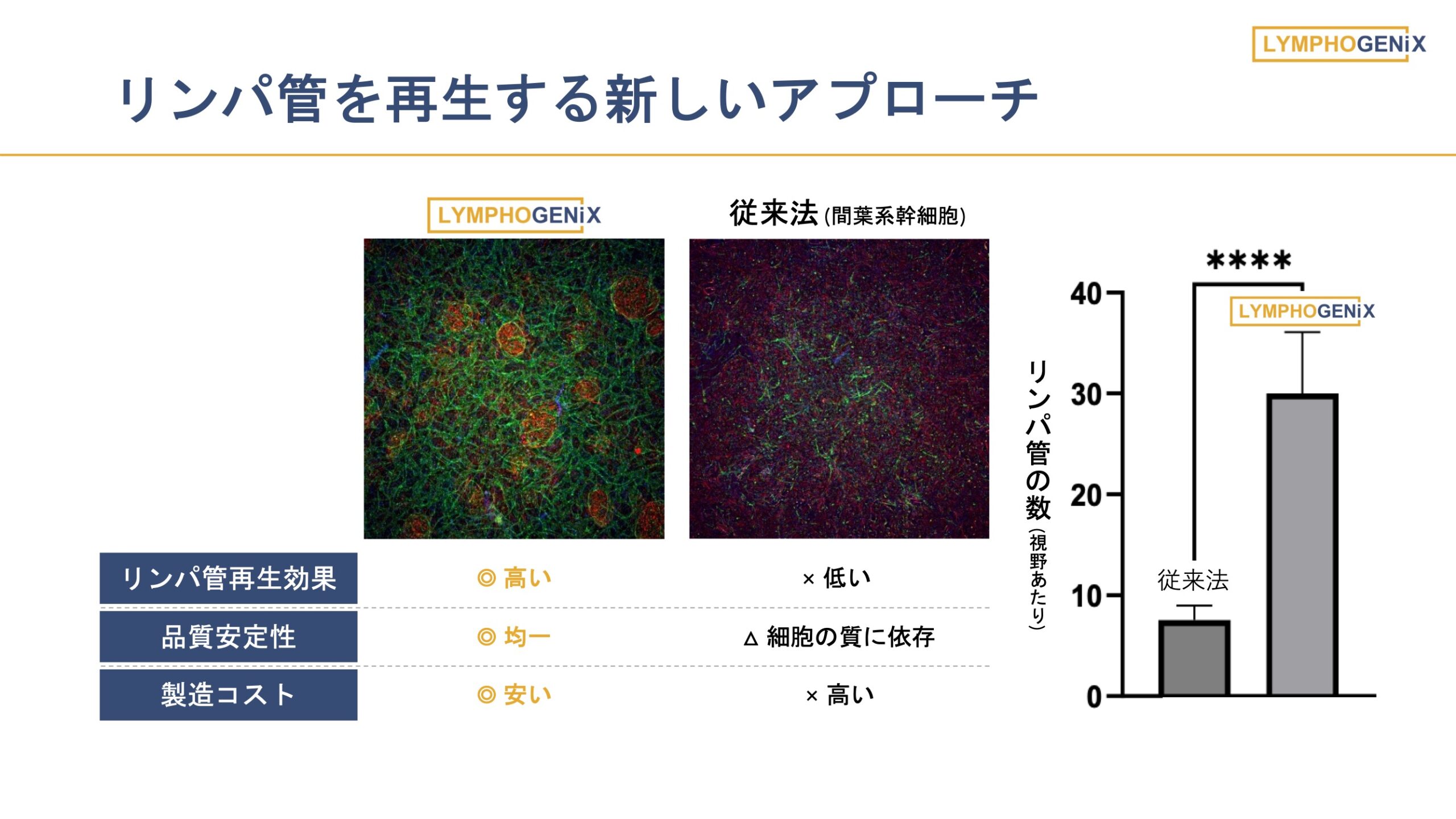 私たちのテクノロジーは、このリンパ管の再生能力に加え、品質の安定性、製造コストの低さなど、商用化に不可欠な要素も高く評価されています。