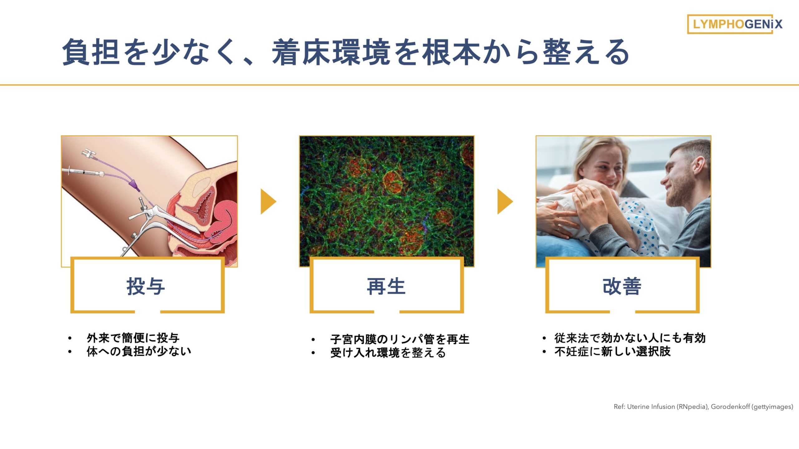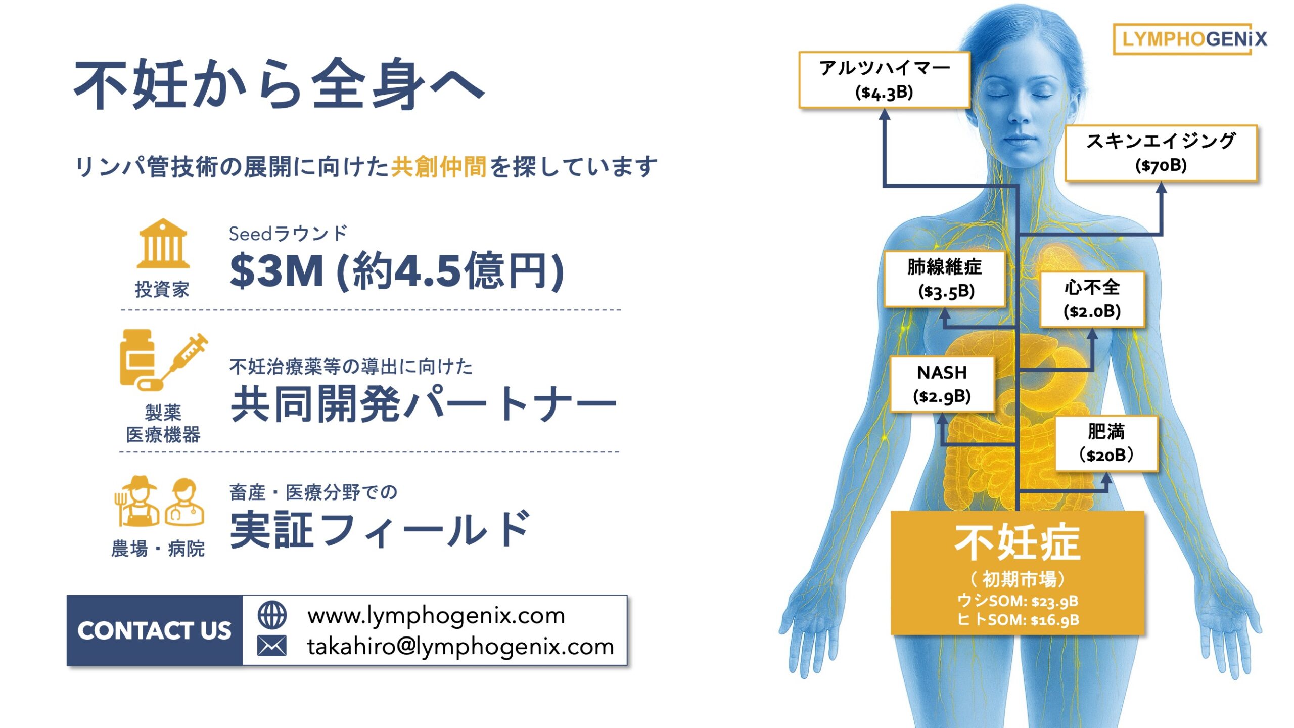 このようなチーム体制で、私たちは不妊治療でのPoC(概念実証)と収益化を起点に、リンパ管再生という新しいモダリティを疾患ごとにバイアウト・ライセンスアウトしていく展開を構想として描いています。