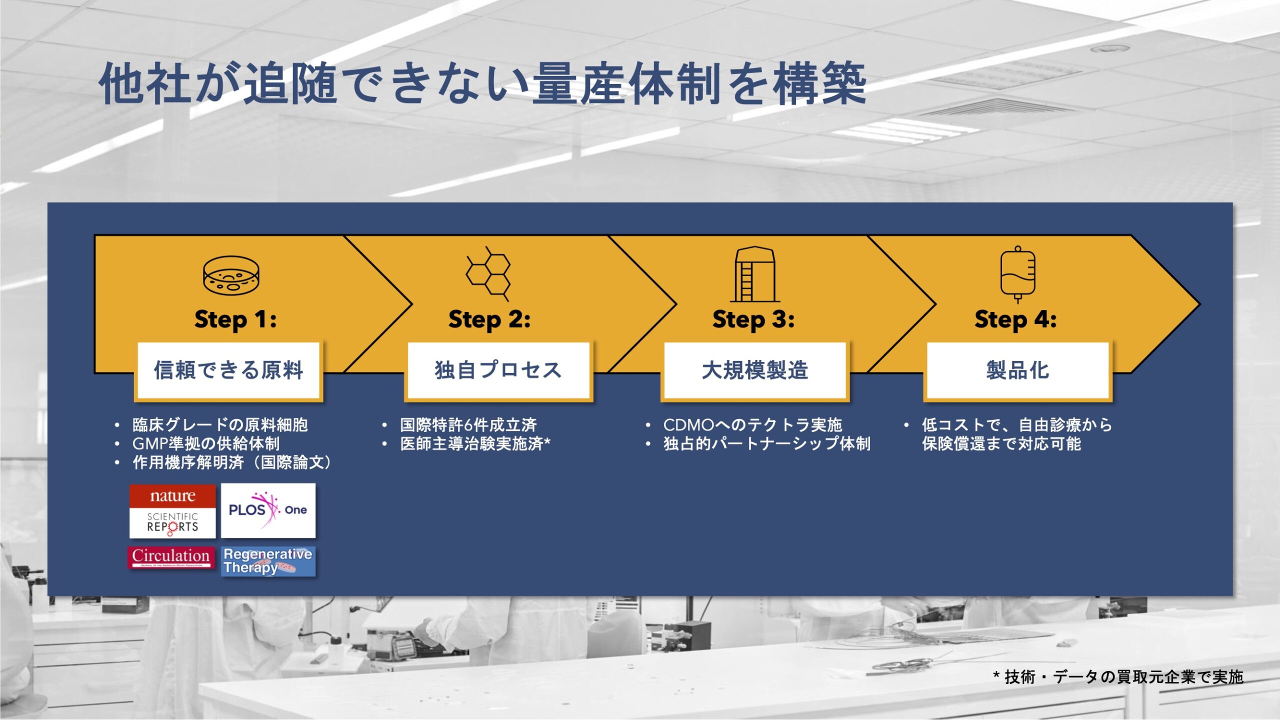 大規模製造に向けた独占的パートナーシップ体制も確立しており、臨床導出やグローバル展開にも対応できる準備が整っています。