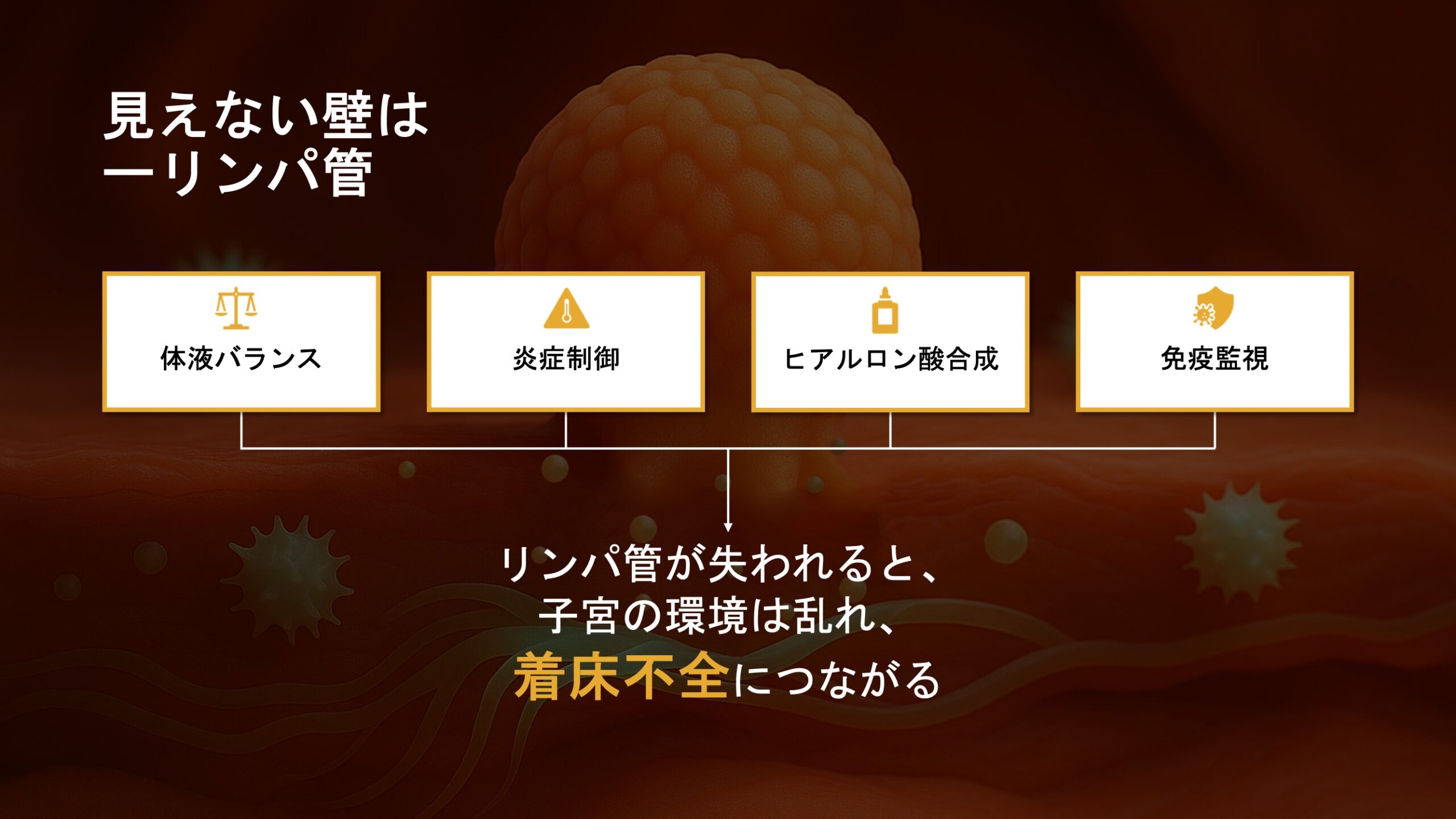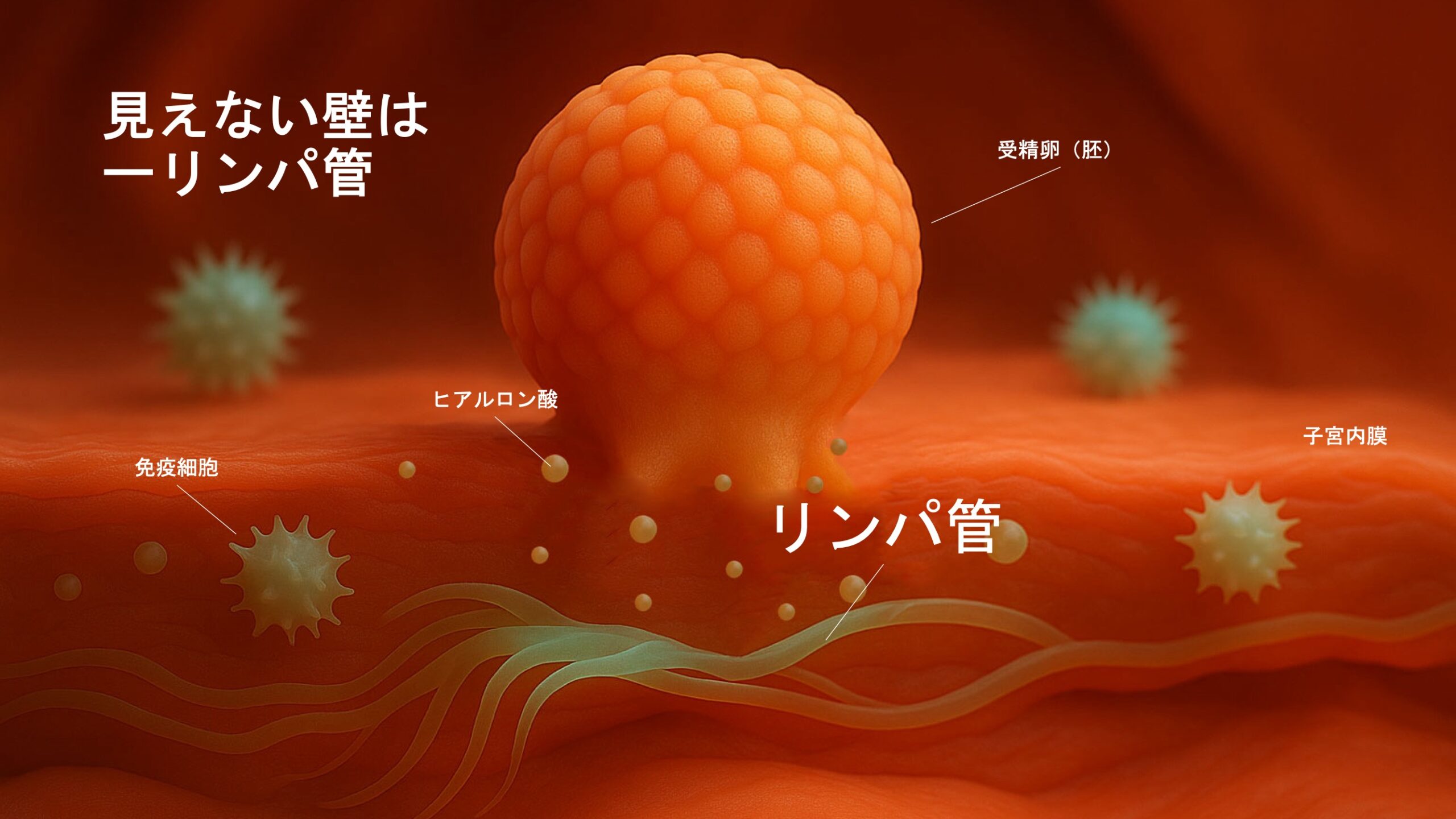 リンパ管は、体液バランスの維持、炎症の制御、ヒアルロン酸合成の促進、免疫の監視など、多様な機能で受精卵が生着する場所である子宮内膜の受け入れ環境を支えています。
