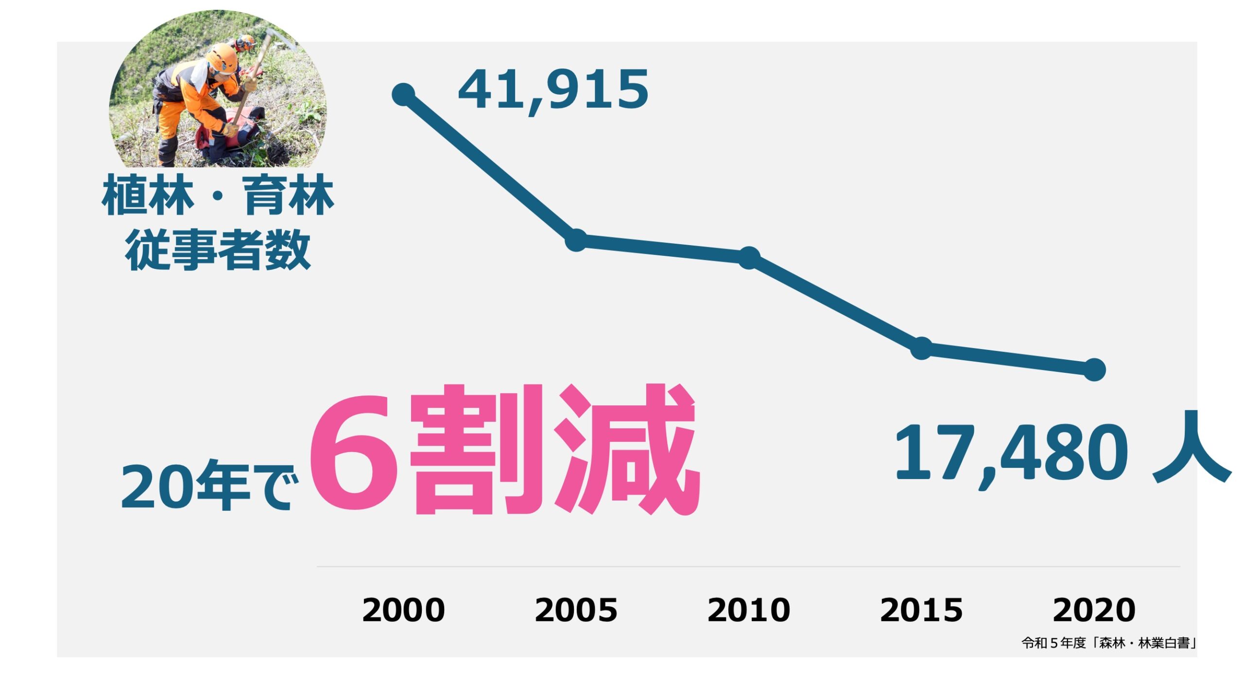 植林・育林従事者は、直近20年間で6割も減少し、ついに約17,000人となりました。