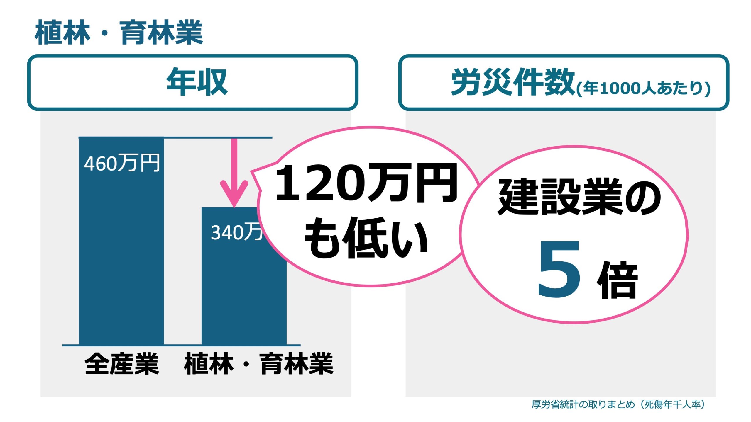 彼らの年収は、全産業に比べますと、120万円も低く、労災リスクは建設業の5倍です。