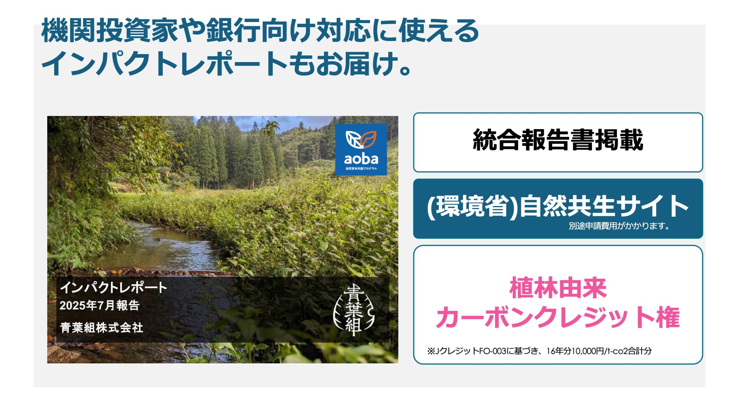 自然再生の結果は、機関投資家や銀行向け対応にも活用できる30ページ以上のインパクトレポートにまとめて、お届けしています。