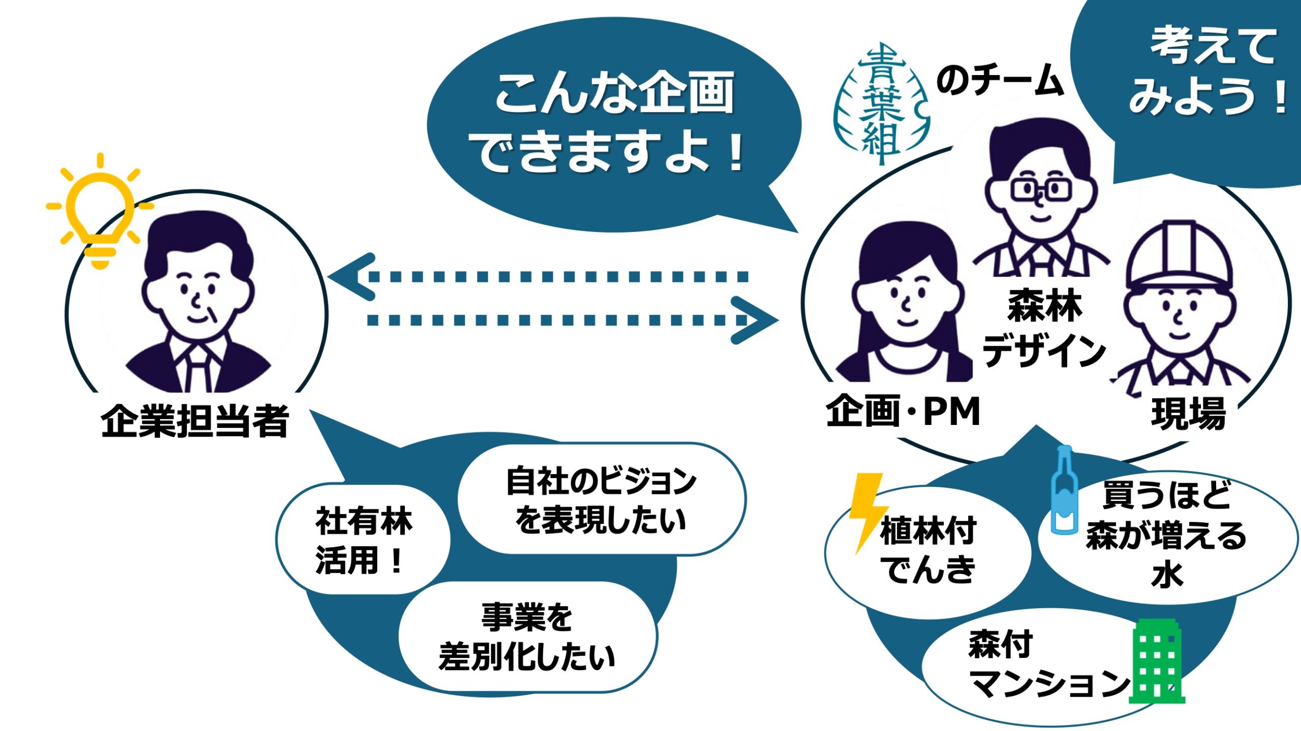 私たちは、企業のニーズから逆算して、企業独自の自然に関わる事業を、ゼロからともに企画します。