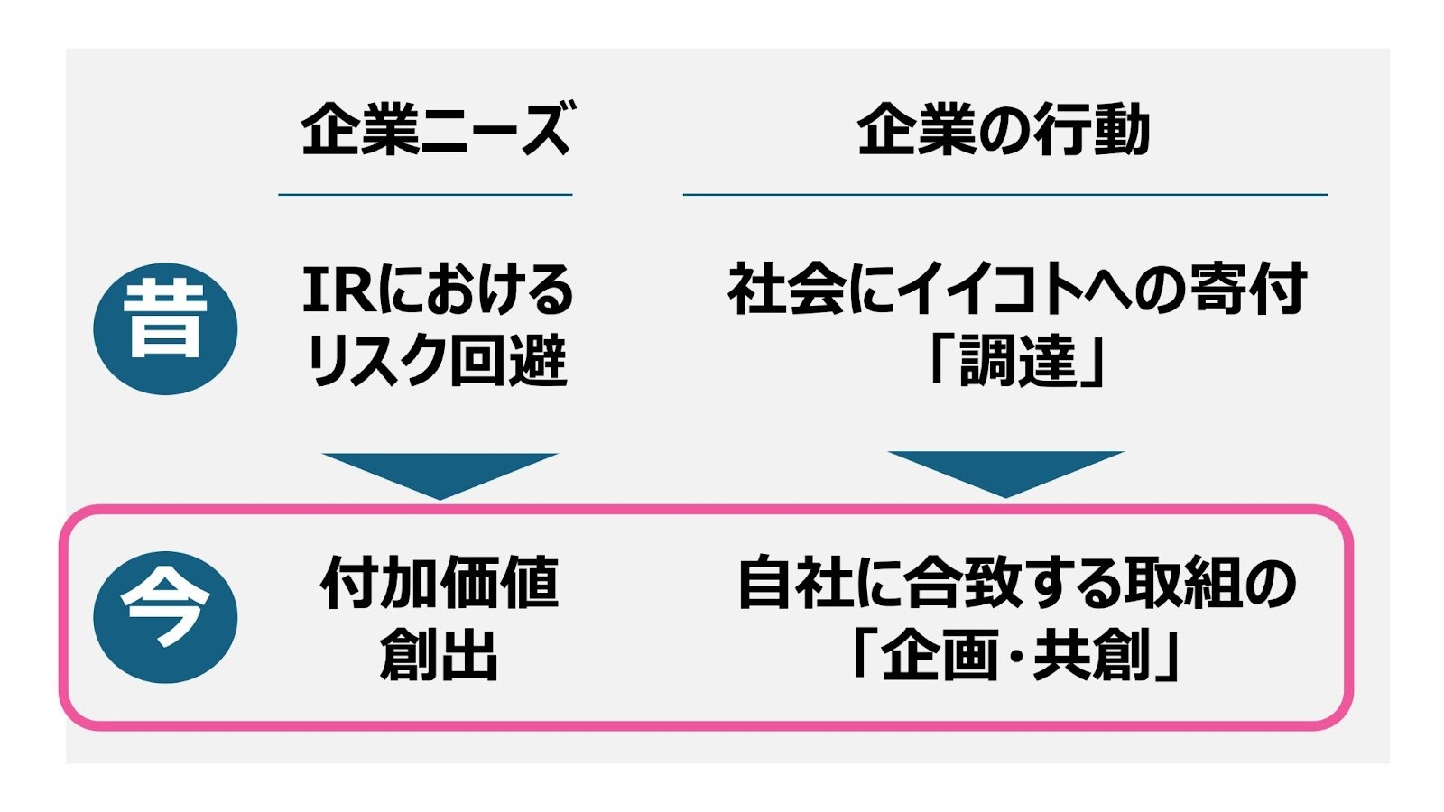 企業のニーズは、単なるIRにおけるリスク回避としての森林への寄付「調達」ではなく、自社事業に連動する取り組みを「企画・共創」するパートナーを探しています。