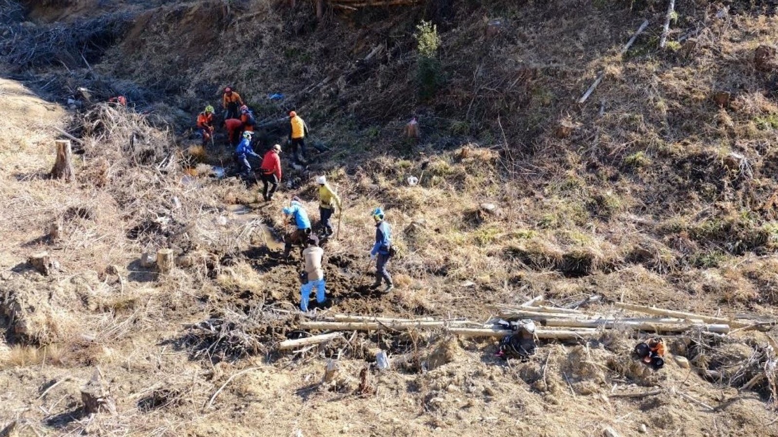 このような山中で放置されて細くなった沢を、小さな湿地帯へと拡張しています。
