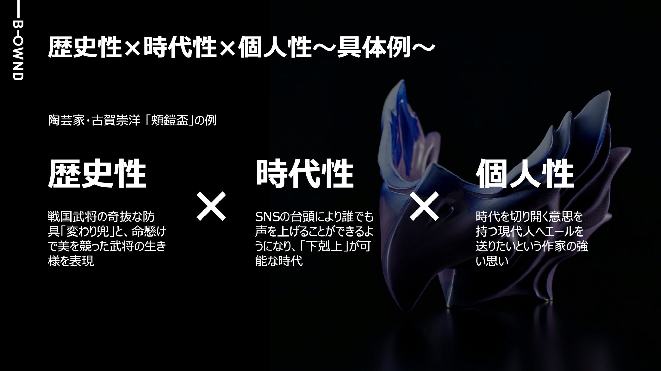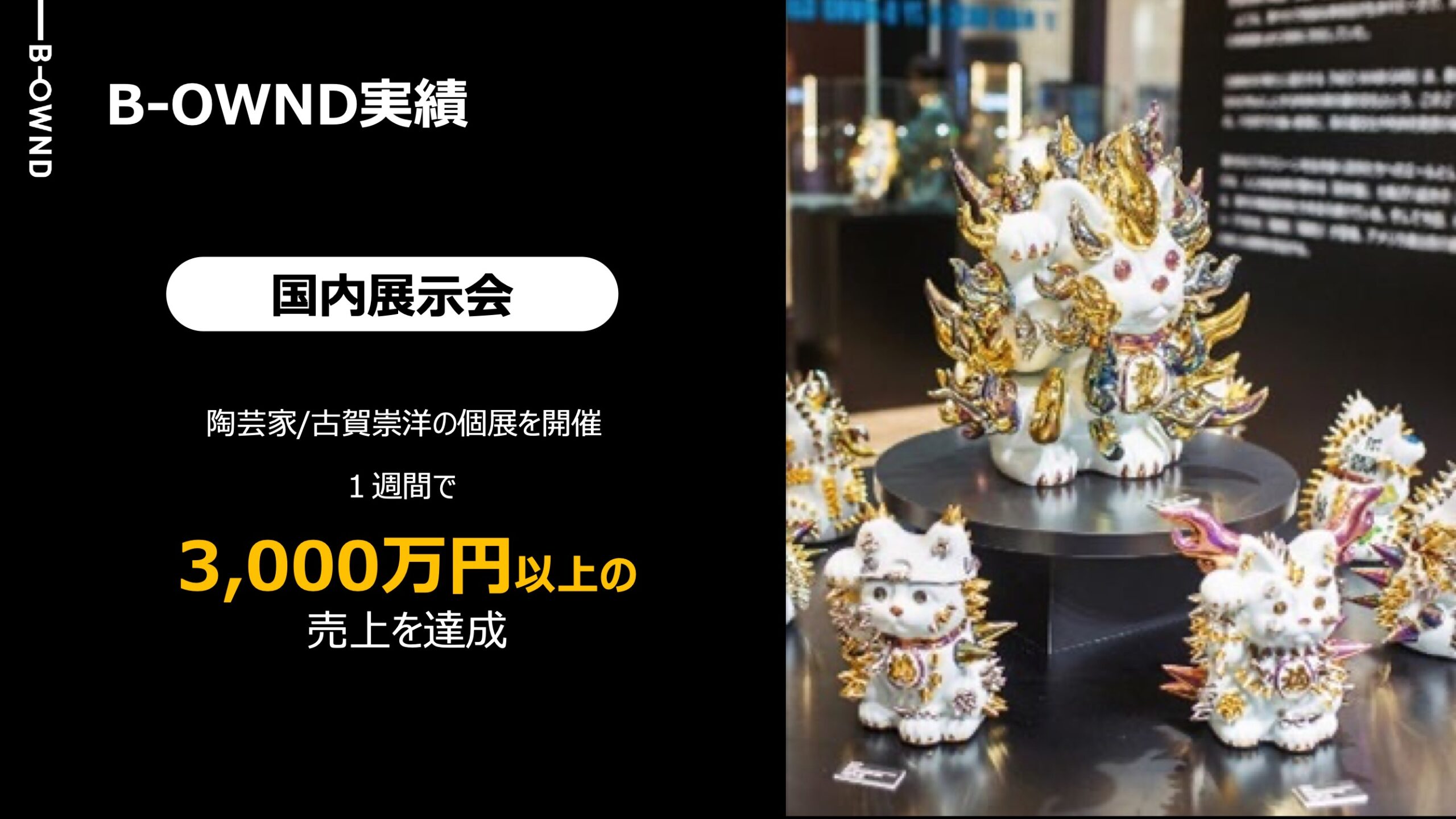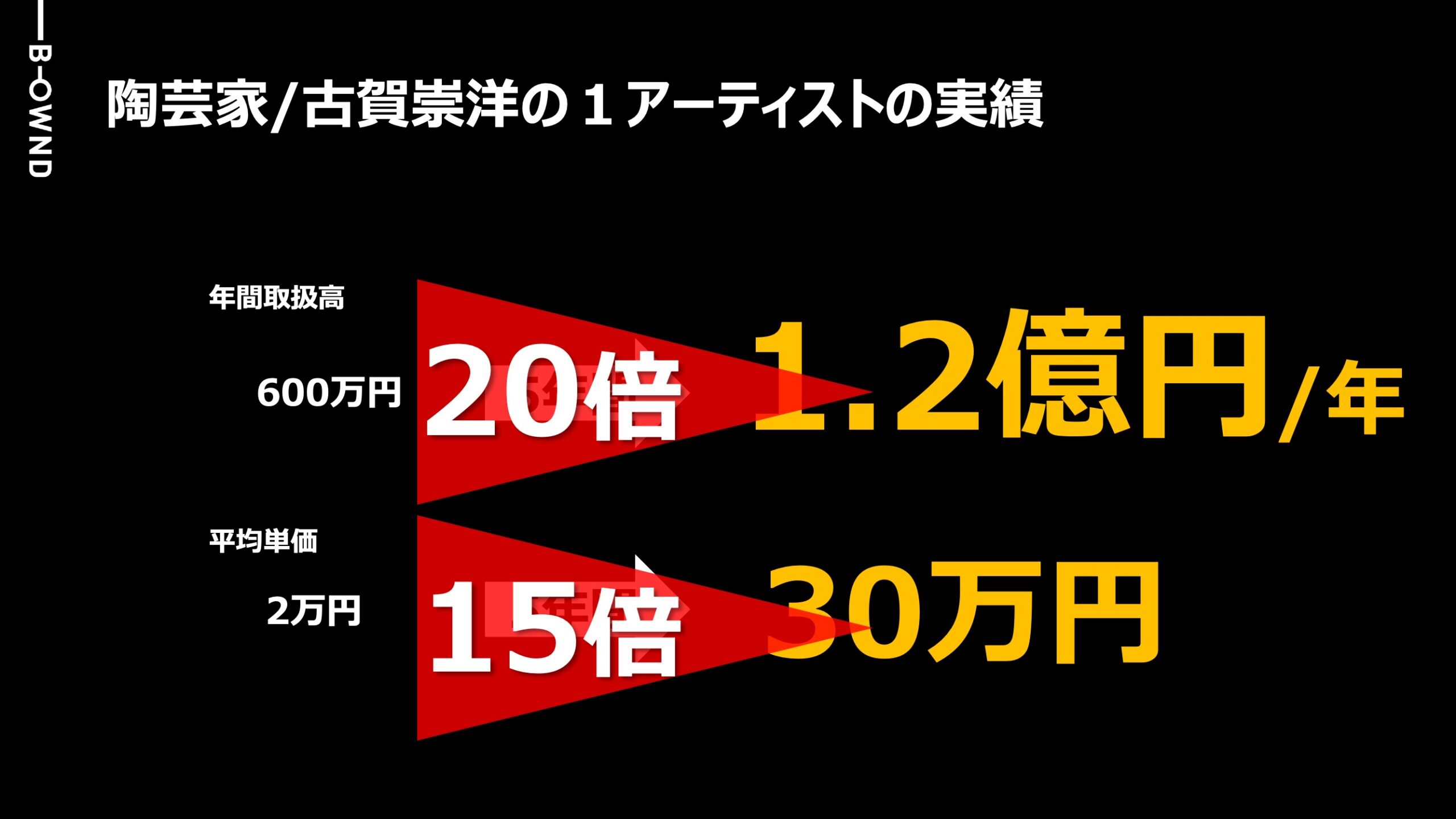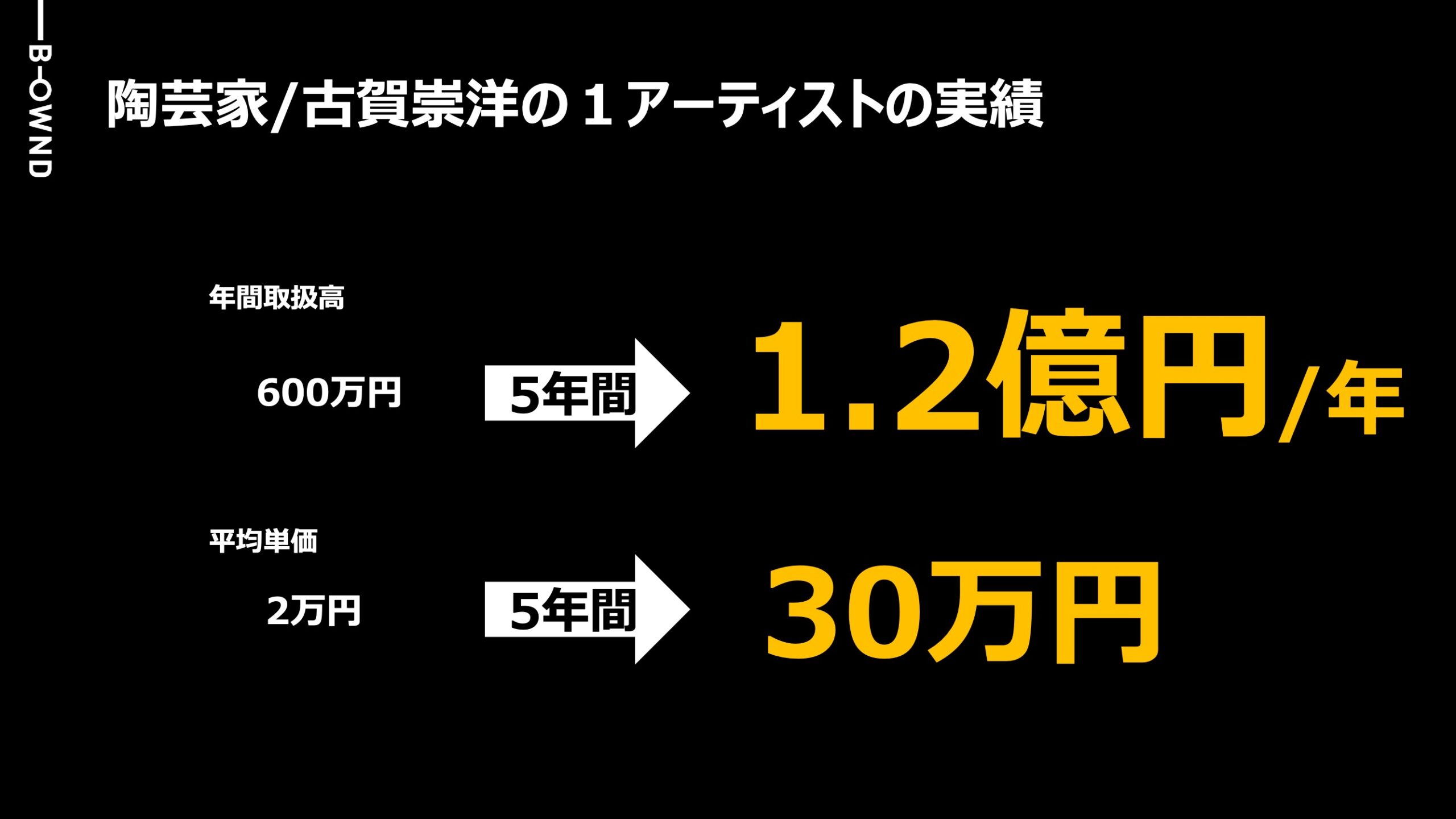 例えば、B-OWND所属の陶芸家は過去5年間で、600万円だった年間売上を1.2億円に、平均単価2万円を30万円に、それぞれ20倍、15倍にすることができました。