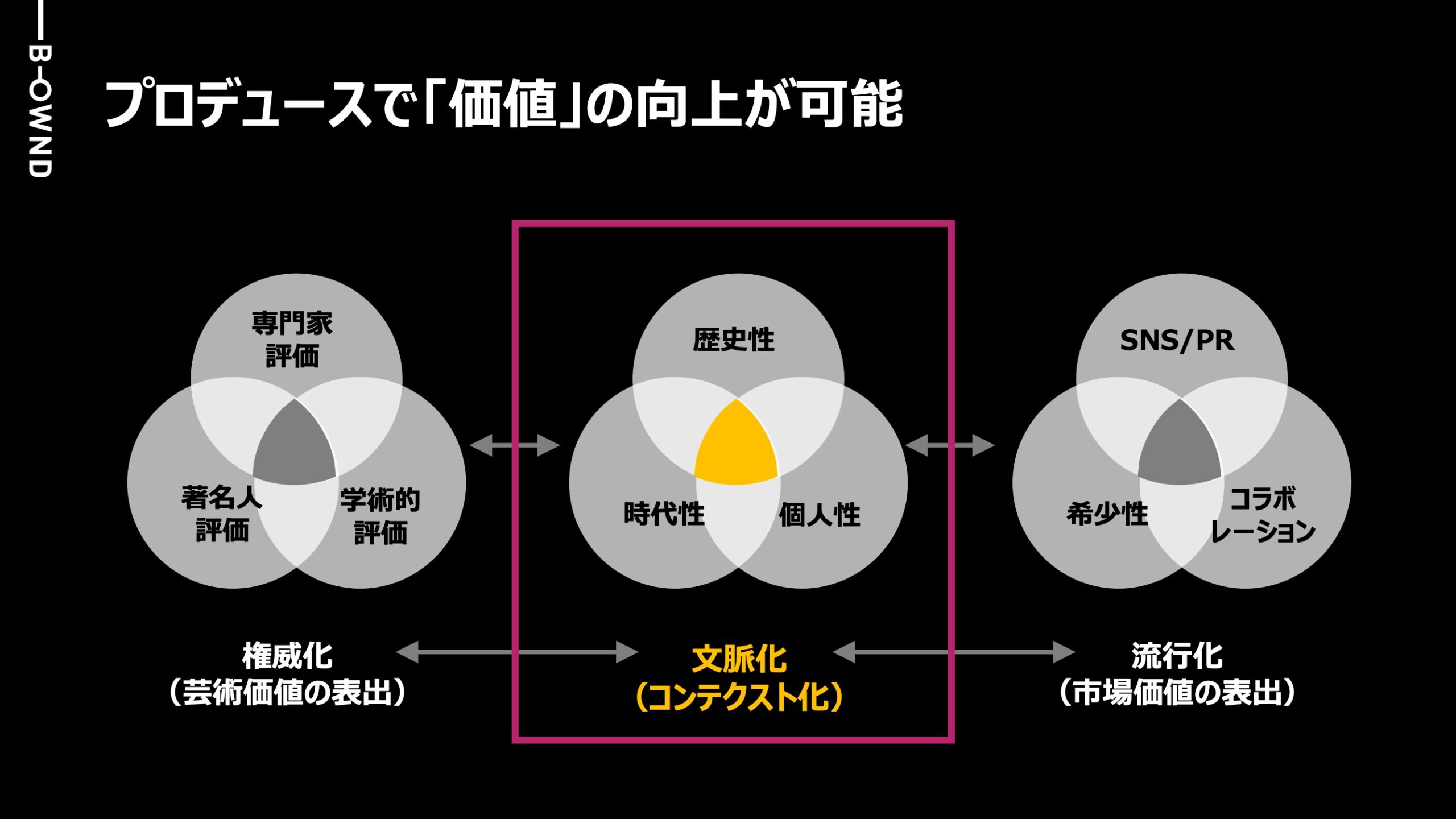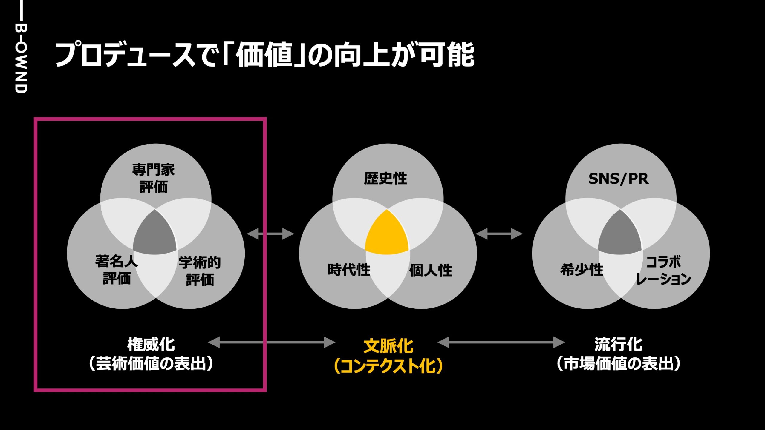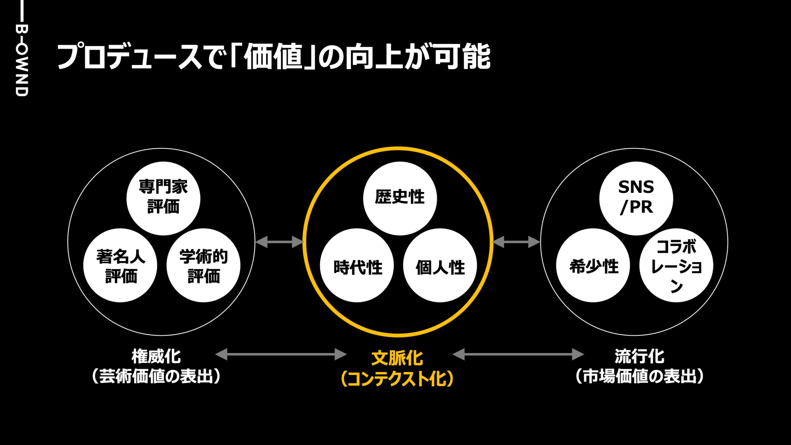 どうすれば価値がつくのかをまとめると、文脈化、芸術価値の権威化、市場価値の流行化の3つの視点によるものということです。