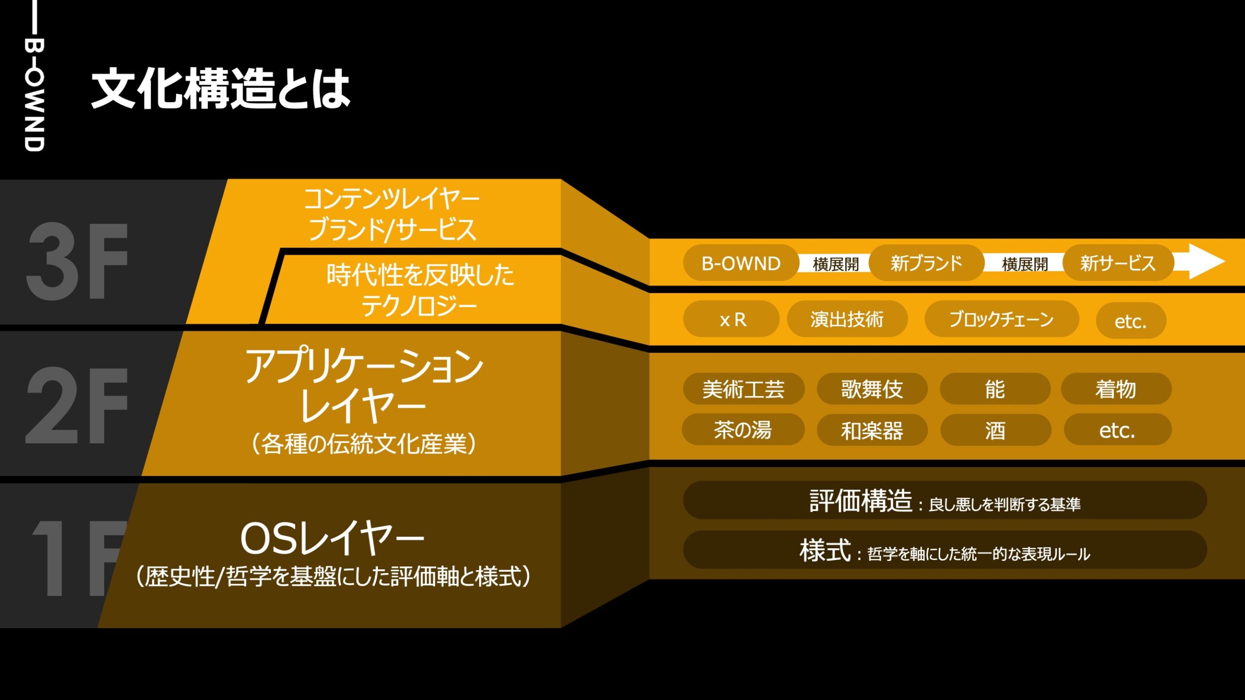 一番上にテクノロジーとブランドがあり、これが文化を広めていくという3階構造です。