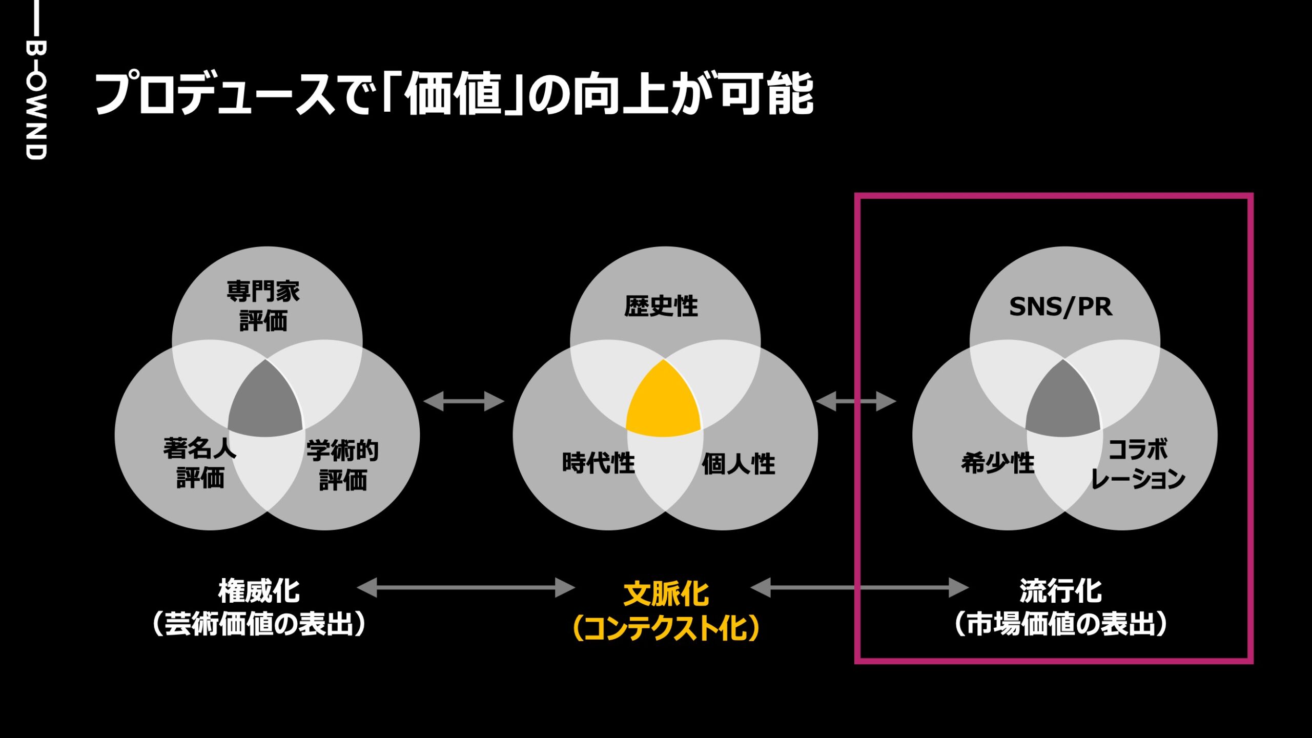 文脈化、流行化、権威化の3つをさまざまな方法で実践してきましたが、個別のプロデュースだけでは超えられない壁があります。