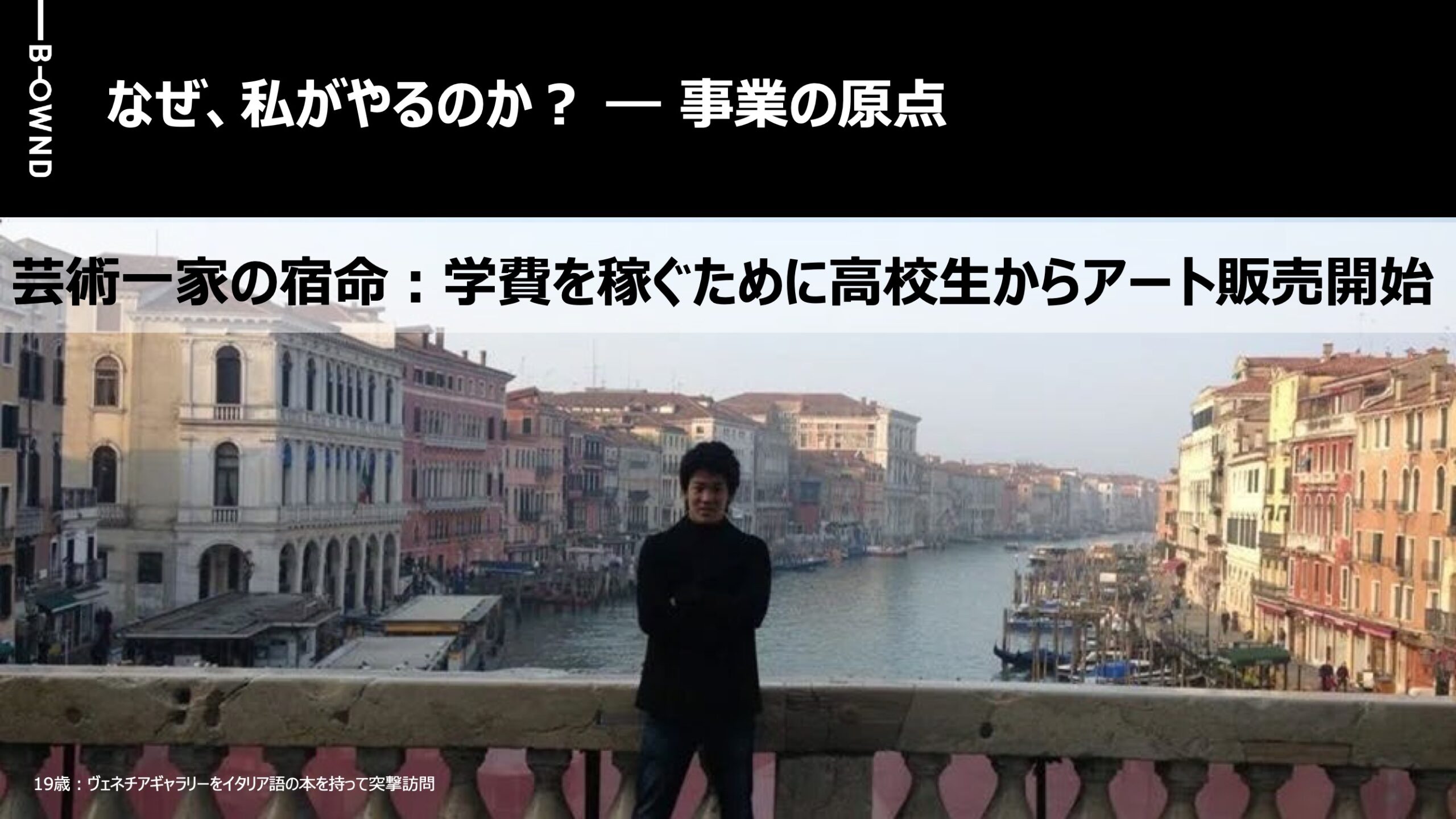 1992年、愛知県にて、画家の父、画商の母の元に生まれる。10代からアート作品の販売をはじめる。国内芸術家の経済活動における困難さを目の当りにし、大学在学中よりアーティストのプロモーション活動を開始する。アート作品のコンセプト立案、WEB・映像制作そして150を超える展覧会の企画等に携わる。国外では、ヴェネチア、ニューヨーク、香港、マイアミなどでの個展やアートフェアの企画販売の実績を持つ。2016年、(株)丹青社に入社後、これまでの経験を活かしアート工芸を中心とした日本の美意識と現代要素を掛け算した新規事業の開発に従事する。2019年、アート・工芸×ブロックチェーンのプラットフォーム「B-OWND」を立ち上げ、プロデューサーに就任。アーティストのキュレーションをはじめとする本事業に関する戦略・企画を構想し、日本のアート・工芸作品の価値を高めることを目指している。2024年、Forbes Japanが選出する世界を動かす文化起業家30人に選出。