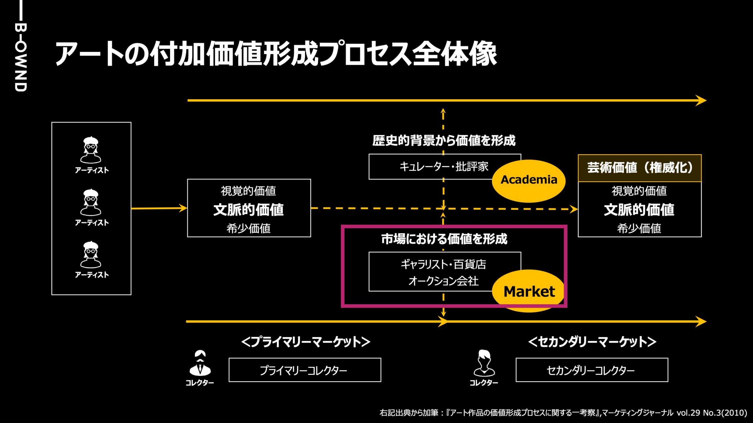 次に、ギャラリーやオークション会社がマーケット側の視点からの価値を付加します。