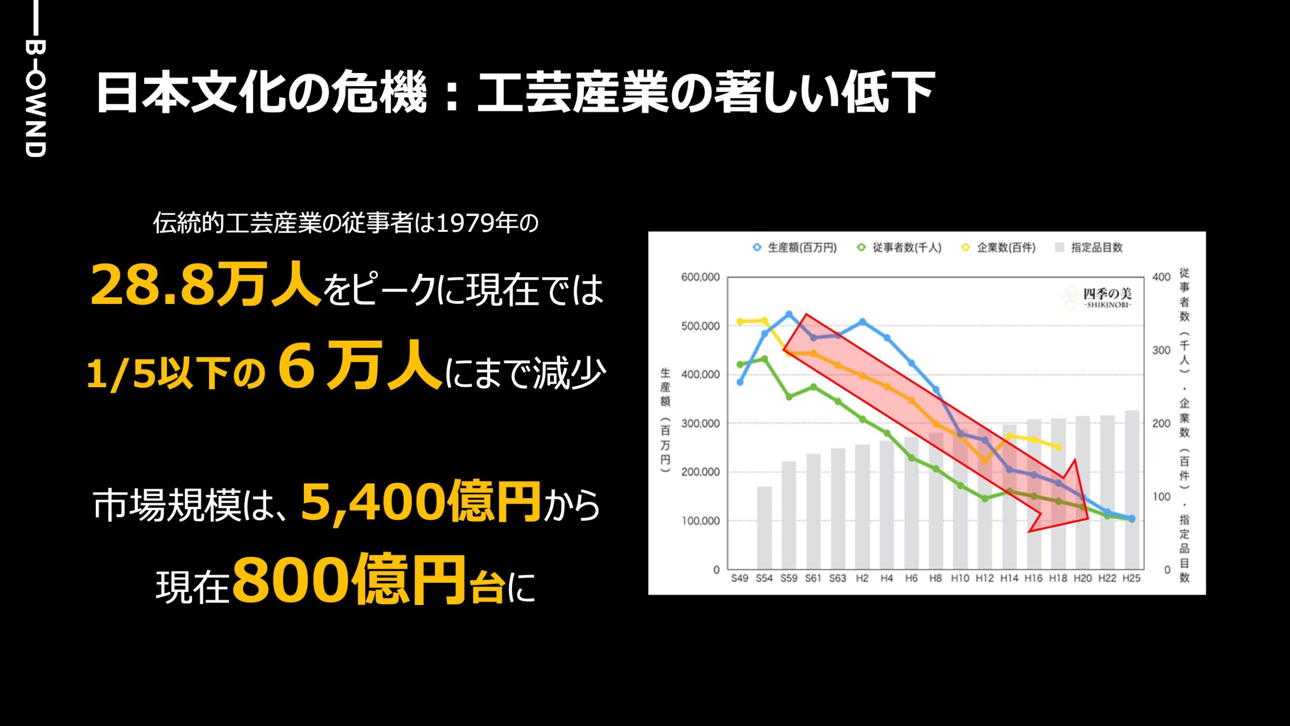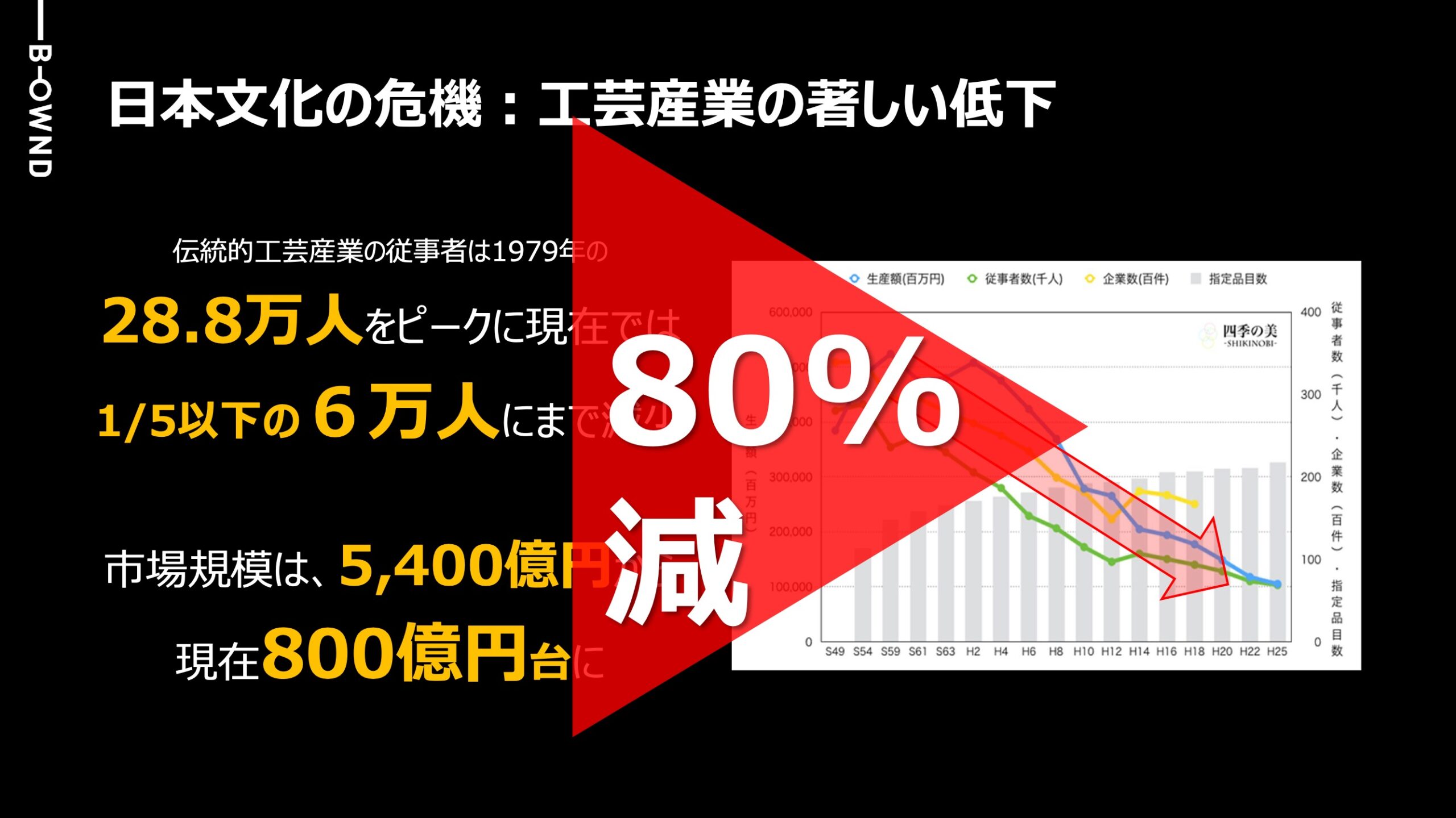 工芸領域の従事者は30万人から6万人になり、市場規模は5,400億円から800億円と、40年間で80%減少しています。