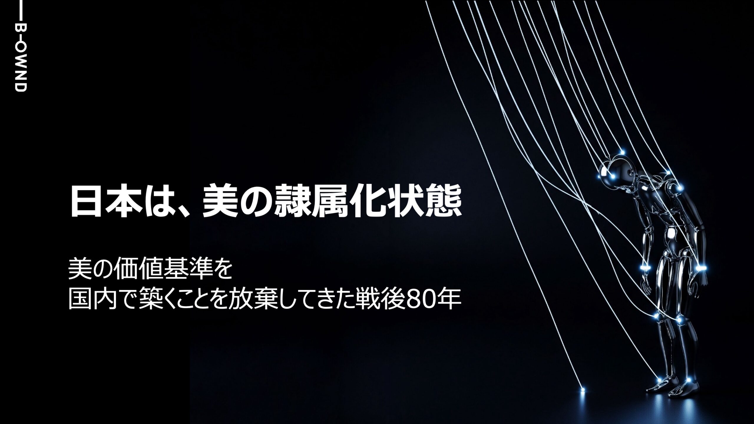 つまり、日本は美の隷属化状態になっており、これは戦後80年間、私たちが価値の物差しを作ることを放棄した結果だと考えています。