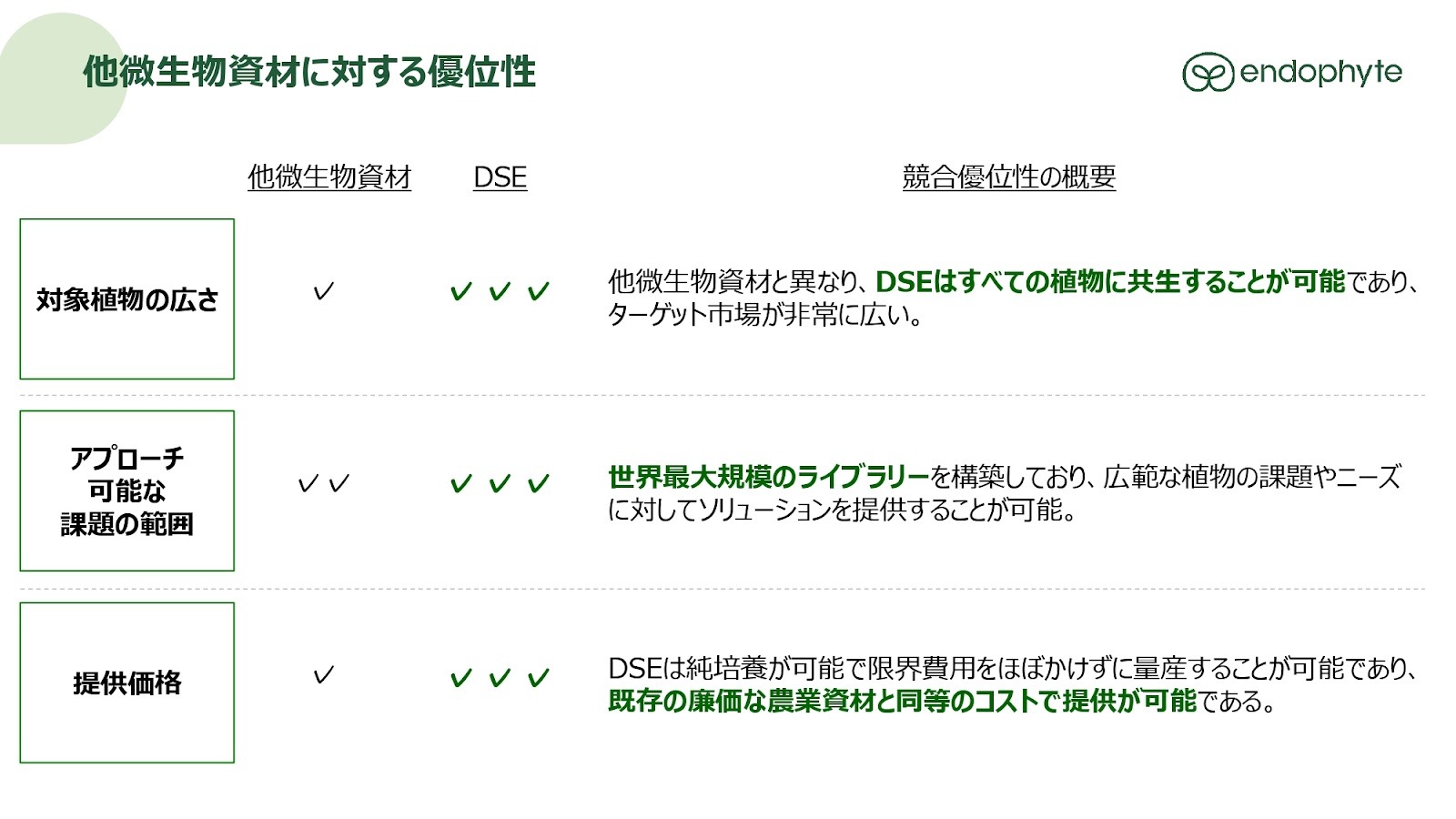 3つ目として、DSEは培養が非常に容易で、原価費用をほぼかけずに大量生産することができ、既存の廉価な農業資材とほぼ同等の価格で提供することが可能という価格戦略上の優位性もあります。