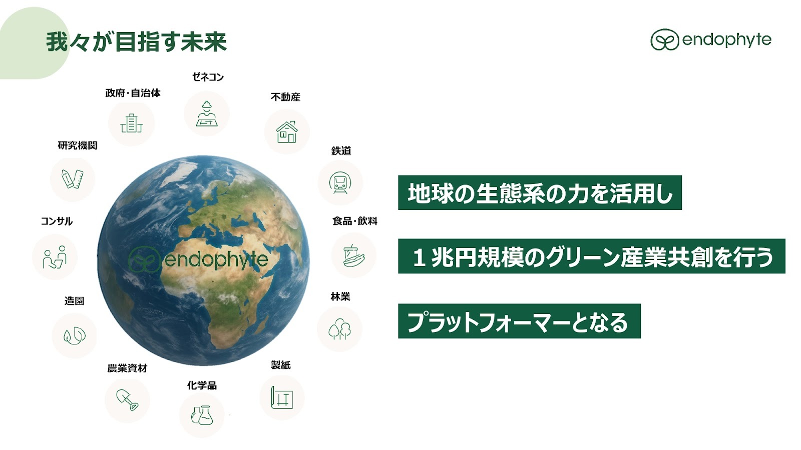産業界全体と連携しながら、地球の生態系の力を活用し、1兆円規模のグリーン産業の共創を行っていくプラットフォーマーの役割を担ってまいります。