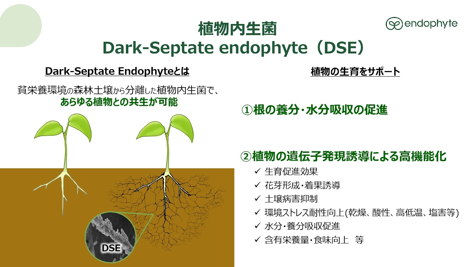 DSEは、森林の生態系から分離・選抜してきたカビの一種で、植物の根に入り込むことで、土壌からの養分と水分の吸収を促進する役割を担っています。