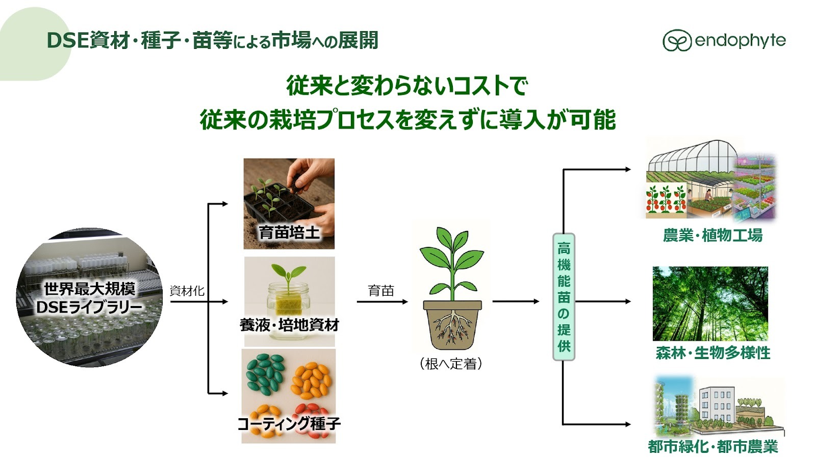 このDSEの菌株を使った農業資材を用いて植物を育てることで、植物の根にDSEが定着した高機能な苗を作ることができ、農業、森林、緑化分野など、幅広い領域に応用活用が可能となっています。