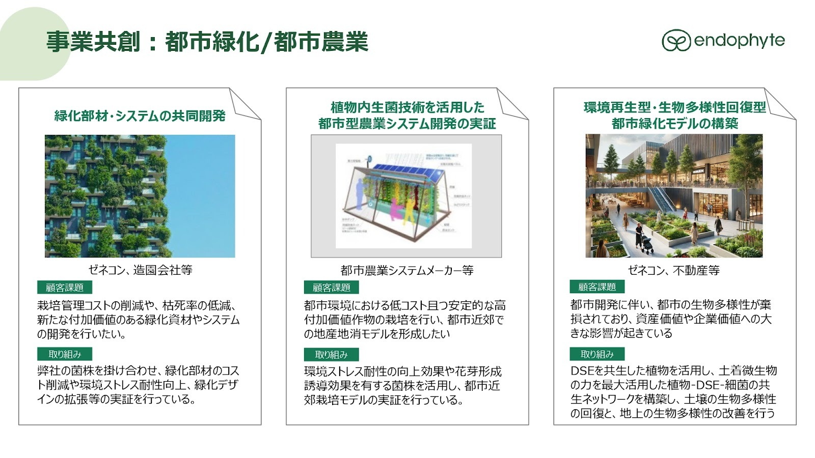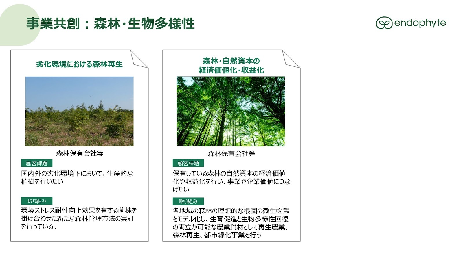 事業モデルとしては、農業、緑化、森林分野で課題を抱えている新規事業のニーズのある事業者と連携して、共同研究開発および事業共創の取り組みを進めています。