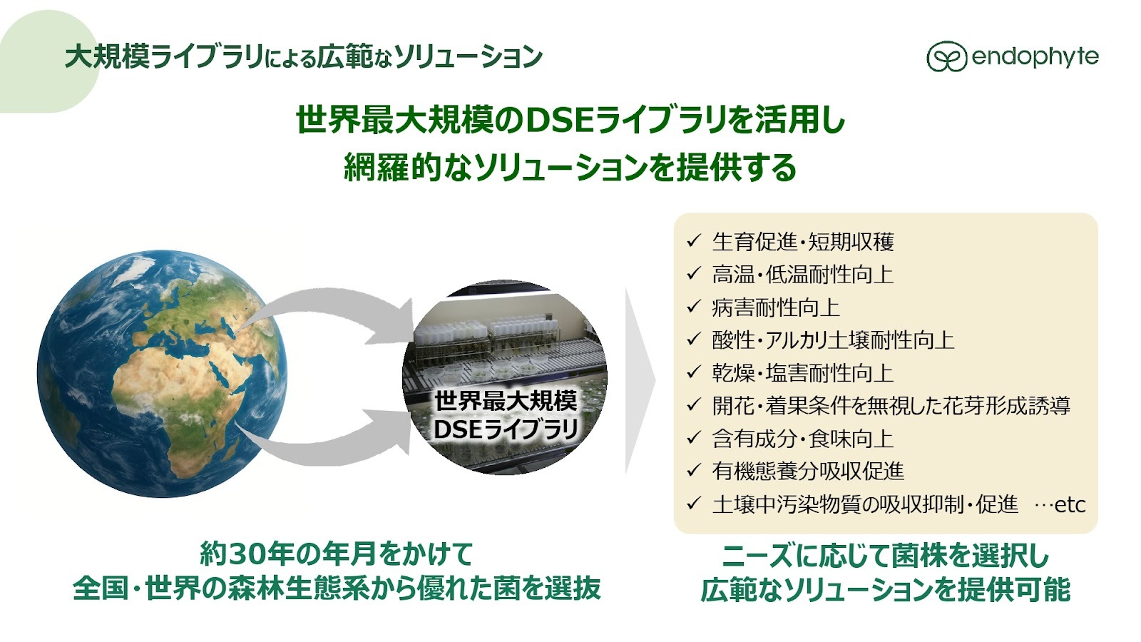 また、2つ目として、先ほどお話しした通り、世界最大規模の菌株ライブラリーを構築しているため、世界でもトップクラスの広範なソリューションの提供が可能です。
