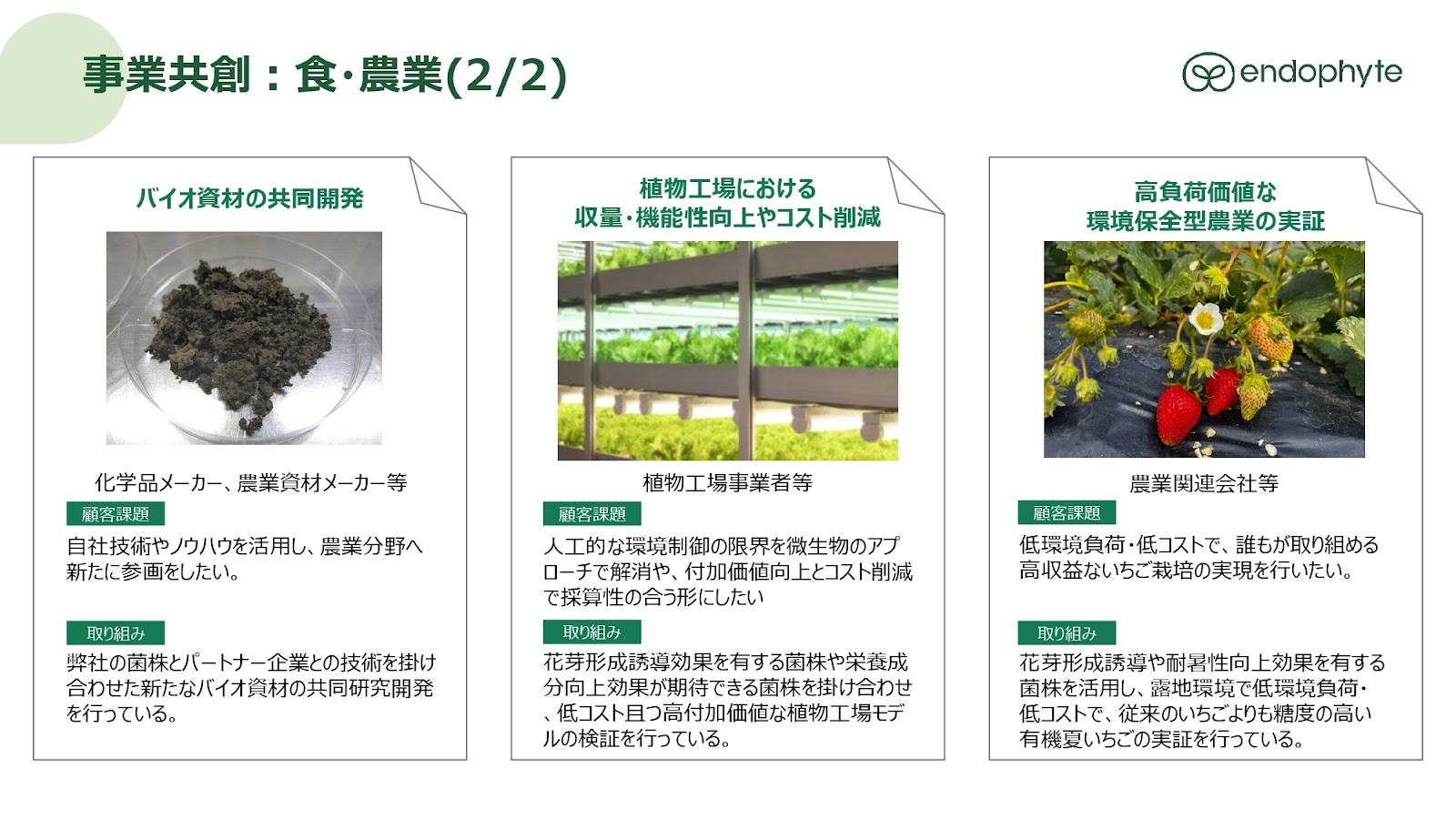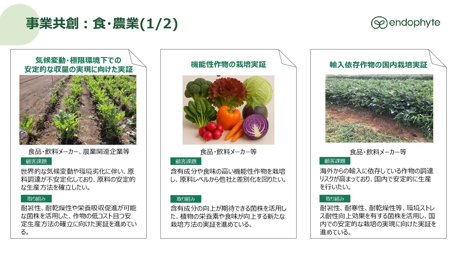 事業共創の事例としては、食品・飲料系の企業と連携しながら、気候変動極限環境下での安定的な作物の栽培、機能性作物の栽培、輸入に依存している作物の地産地消モデルの実証、バイオ資材の共同開発、植物工場の機能性向上、環境再生型農業の取り組みなどを行っています。
