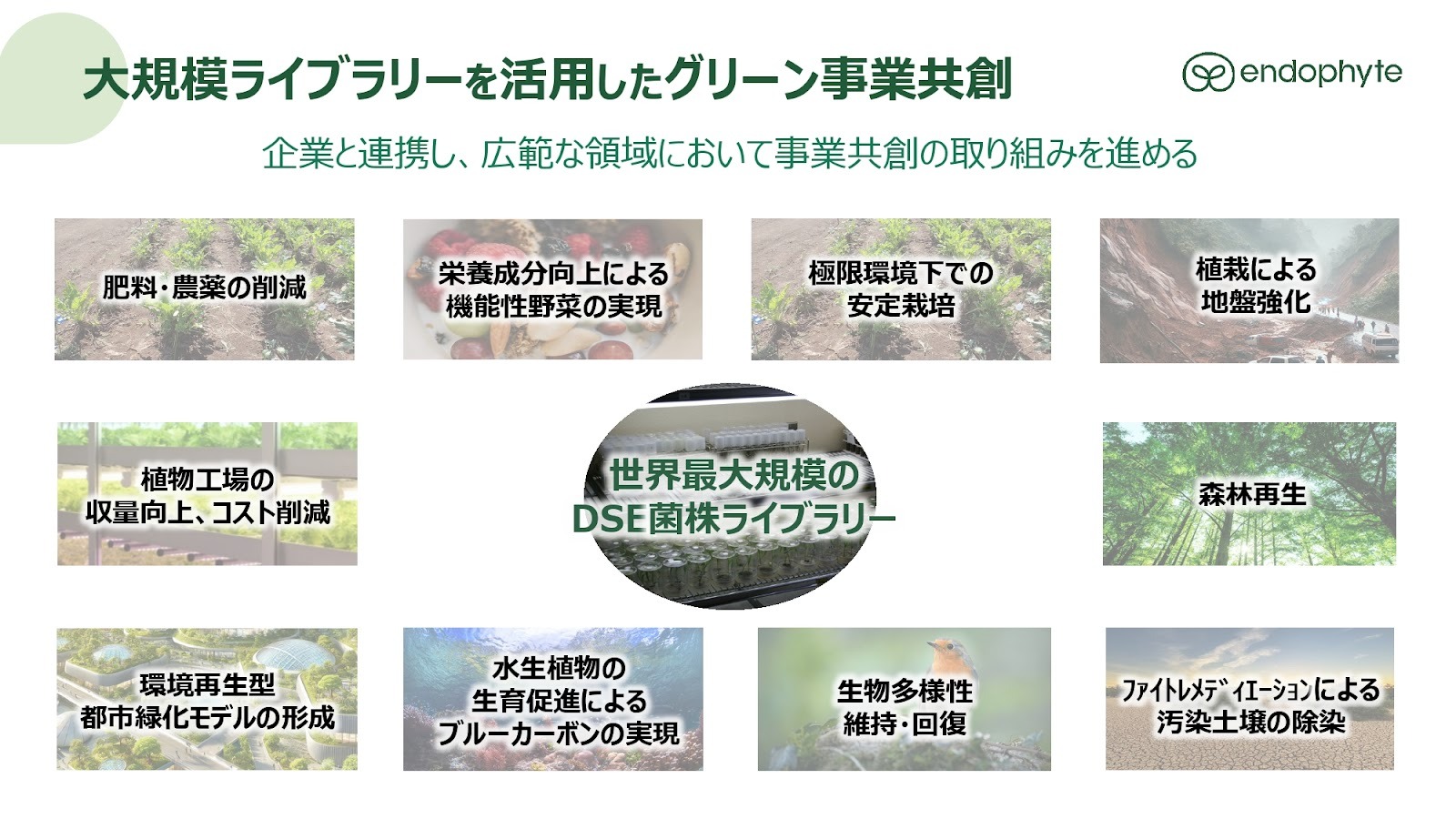 弊社は、こうした環境課題全般に対して、保有している汎用的な機能を持つDSEの菌株ライブラリーを活用し、企業と連携して事業共創を行い、包括的にアプローチしています。