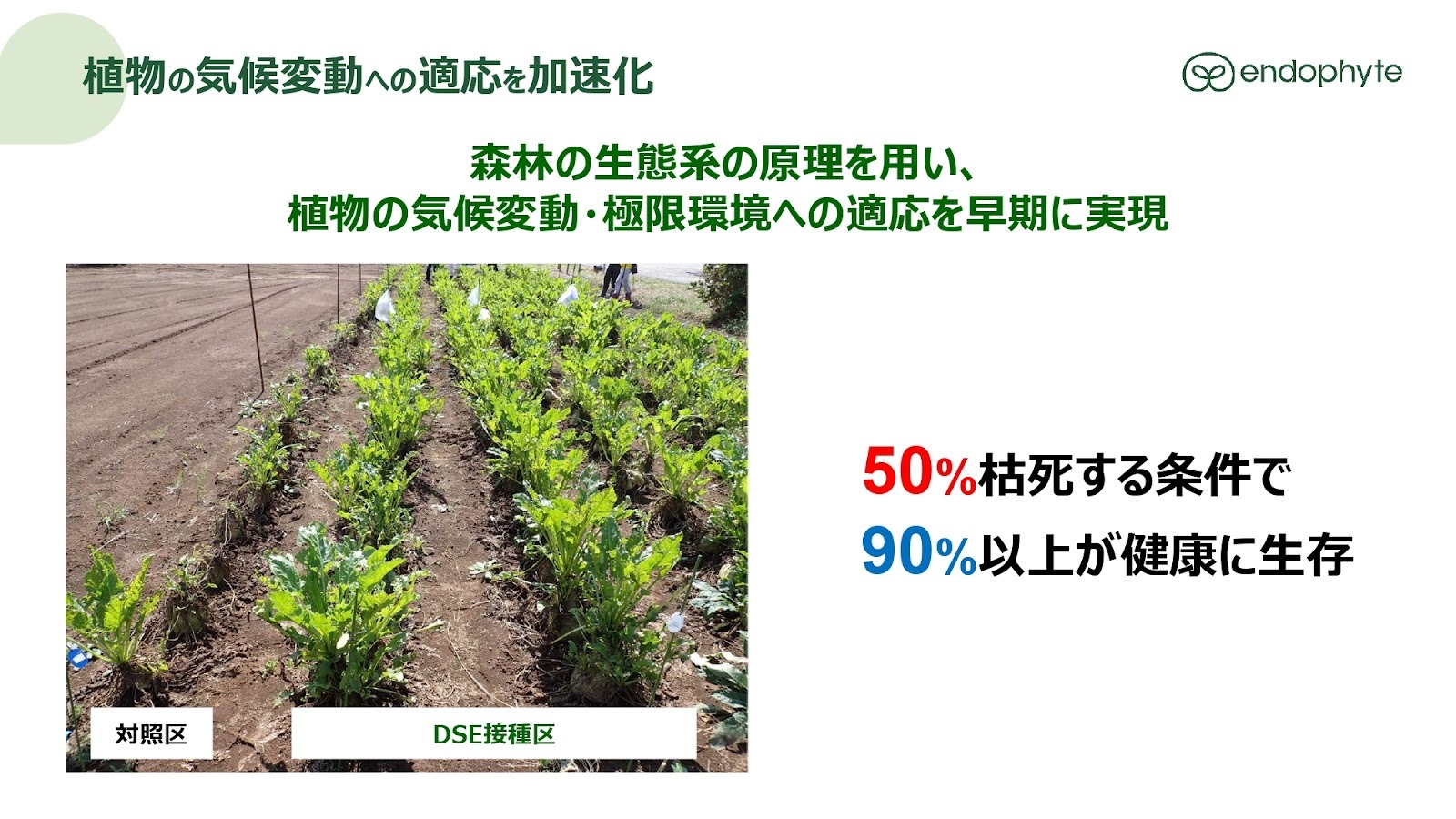 弊社のDSEを植物の根に定着させた状態で生育させることで、通常50%以上枯れてしまう気候変動極限環境下でも、90%以上の植物が健康に生存することが可能になります。