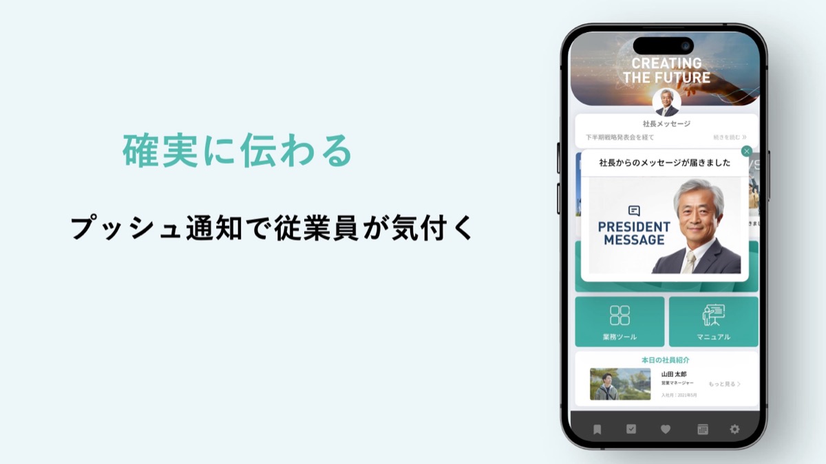 ワンタップで欲しい情報に気軽にアクセスでき、プッシュ通知で従業員が気付くから確実に伝わるのです。