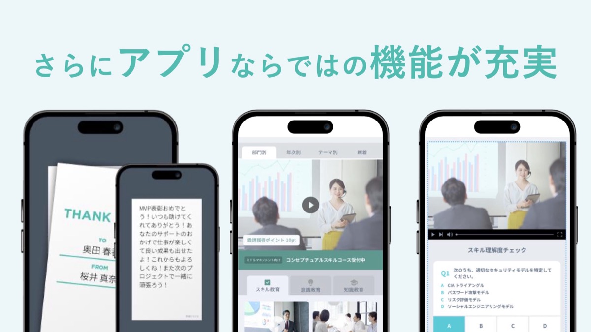 さらに、社員同士のつながりを作るサンクスカード、学びを促進する研修動画やテストという機能もあります。