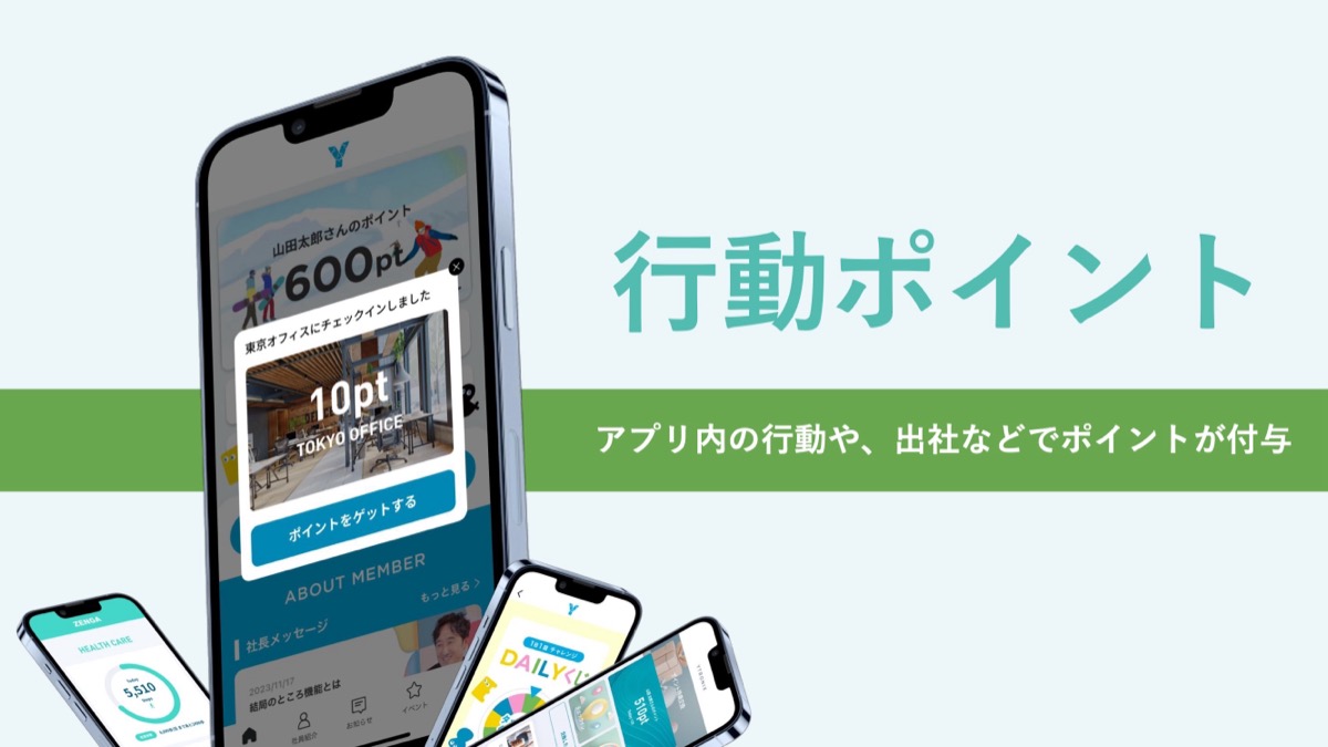例えば、アプリ内の行動や出社実績をもとに行動ポイントを付与できる。