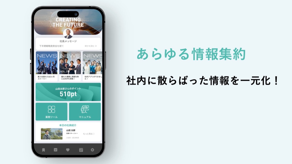 経営者のメッセージはもちろん、業務ツール、マニュアル、営業資料などを全てアプリに集約することができます。