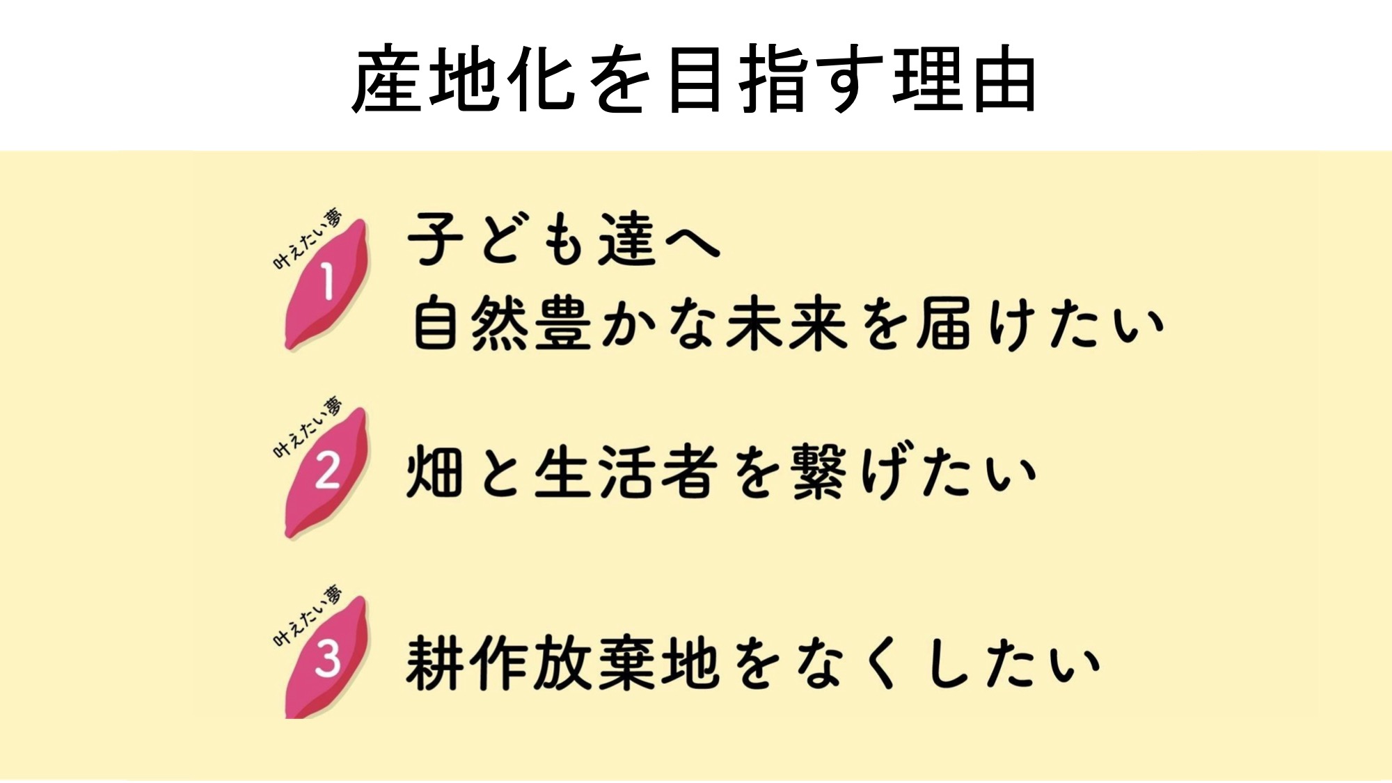 産地化を目指す理由、それは子ども達へ自然豊かな未来を届けたい、畑と生活者を繋げたい、耕作放棄地をなくしたい、この3点です。