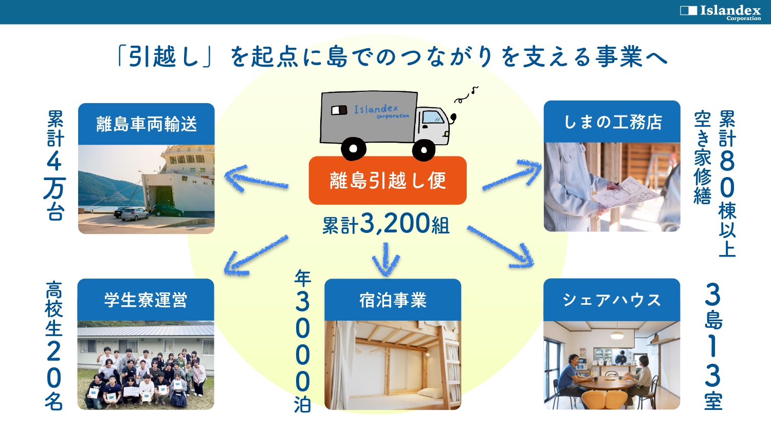 今では引越しを起点に、離島の空き家を大量に直したり、それをシェアハウスやゲストハウスにしたりして、すでに島でのつながりを支える事業が広がっています。